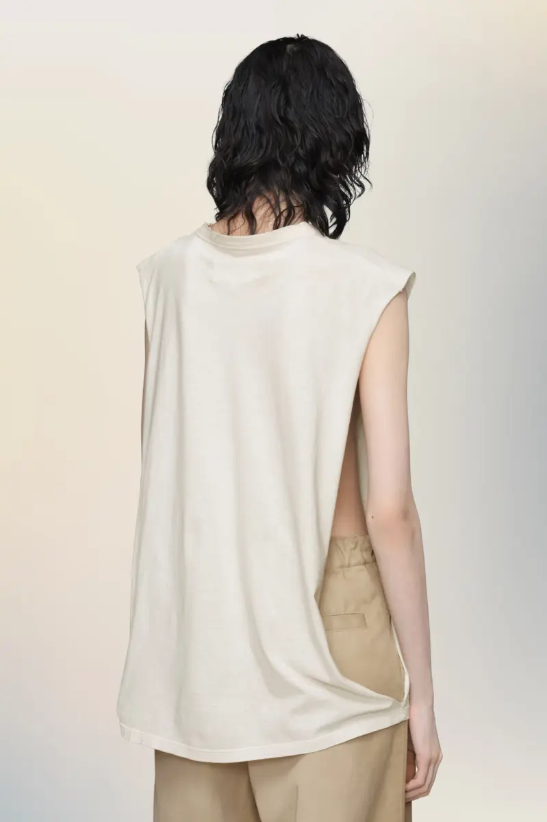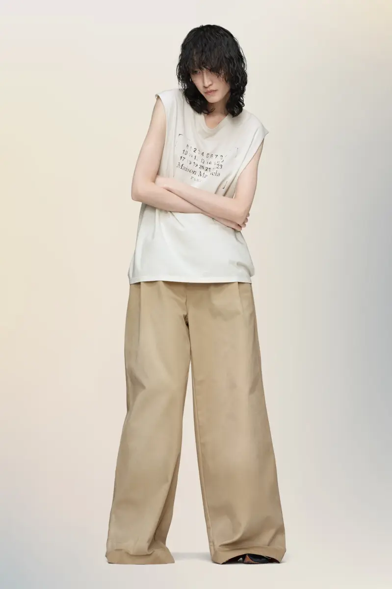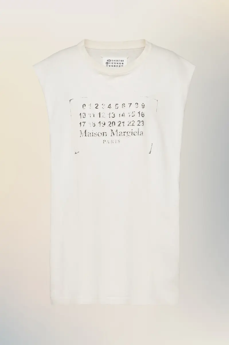 Minimalista nella costruzione e nel taglio per facilitare la sovrapposizione, questo top senza maniche è rifinito con bordi grezzi e una versione sbiadita del logo numerico della Maison. La firma di Maison Margiela, i quattro punti, appare sul retro; l’opposto di un’etichetta.