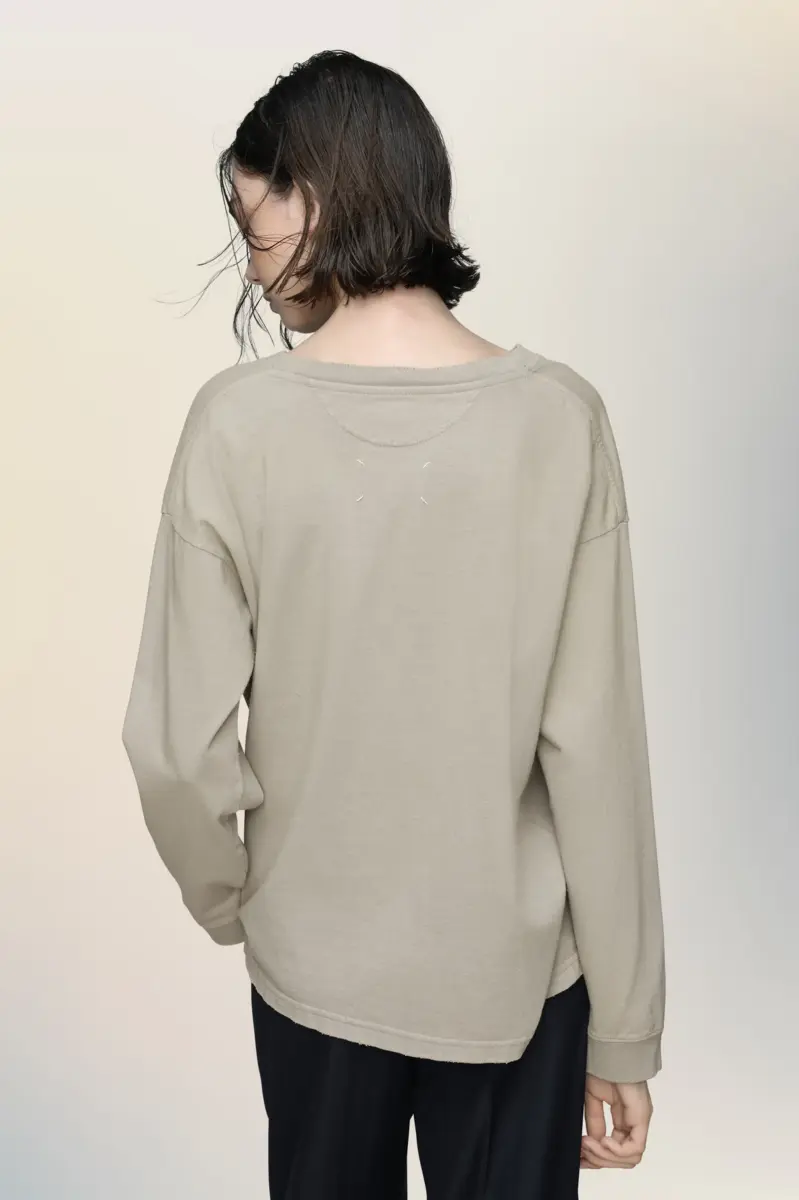 Questa T-shirt a maniche lunghe gioca con una reinterpretazione grafica della cartella del bingo. Maison Margiela rivisita i codici visivi familiari con sottile ironia, qui declinati in un taglio pulito e classico. Le quattro cuciture sono visibili sul retro, l’opposto di un’etichetta.