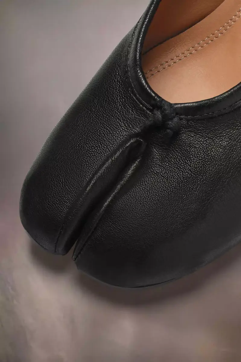 Maison Margiela presenta le nuove ballerine Tabi, il cui design trae ispirazione dalle ballerine presenti negli archivi della maison. Sono realizzate in morbida nappa con un trattamento used artigianale applicato su pieghe, base e cuciture, lavorato manualmente per creare un effetto vintage artigianale. Presentano la punta divisa Tabi, ispirata al tradizionale calzino giapponese del XV secolo che porta lo stesso nome, lanciato per la collezione di debutto della Maison nel 1989. Cattura lo spirito avanguardista e insubordinato della Maison e si presenta come un classico della tradizione, continuamente esplorato in ogni collezione.