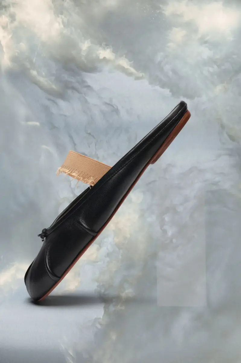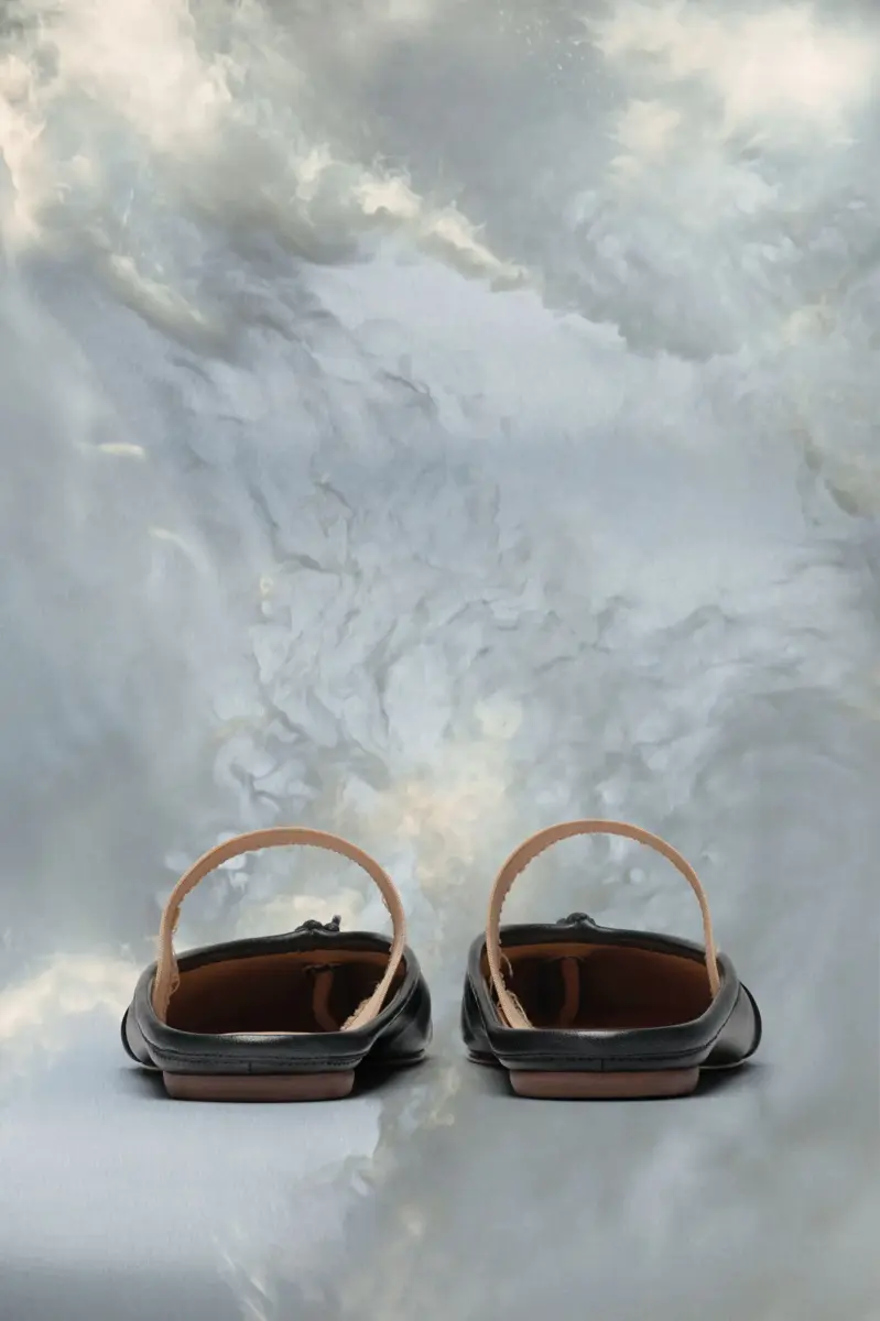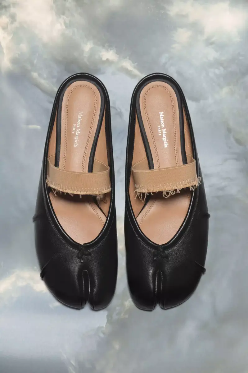 In pelle con pieghe fatte a mano, le mules presentano una fascia elastica effetto consumato e la punta divisa Tabi, ispirata alla tradizionale calza giapponese del XV secolo che porta lo stesso nome, lanciata per la collezione di debutto della Maison nel 1989. Cattura lo spirito avanguardista e insubordinato della Maison e si presenta come un classico della tradizione, continuamente esplorato in ogni collezione.