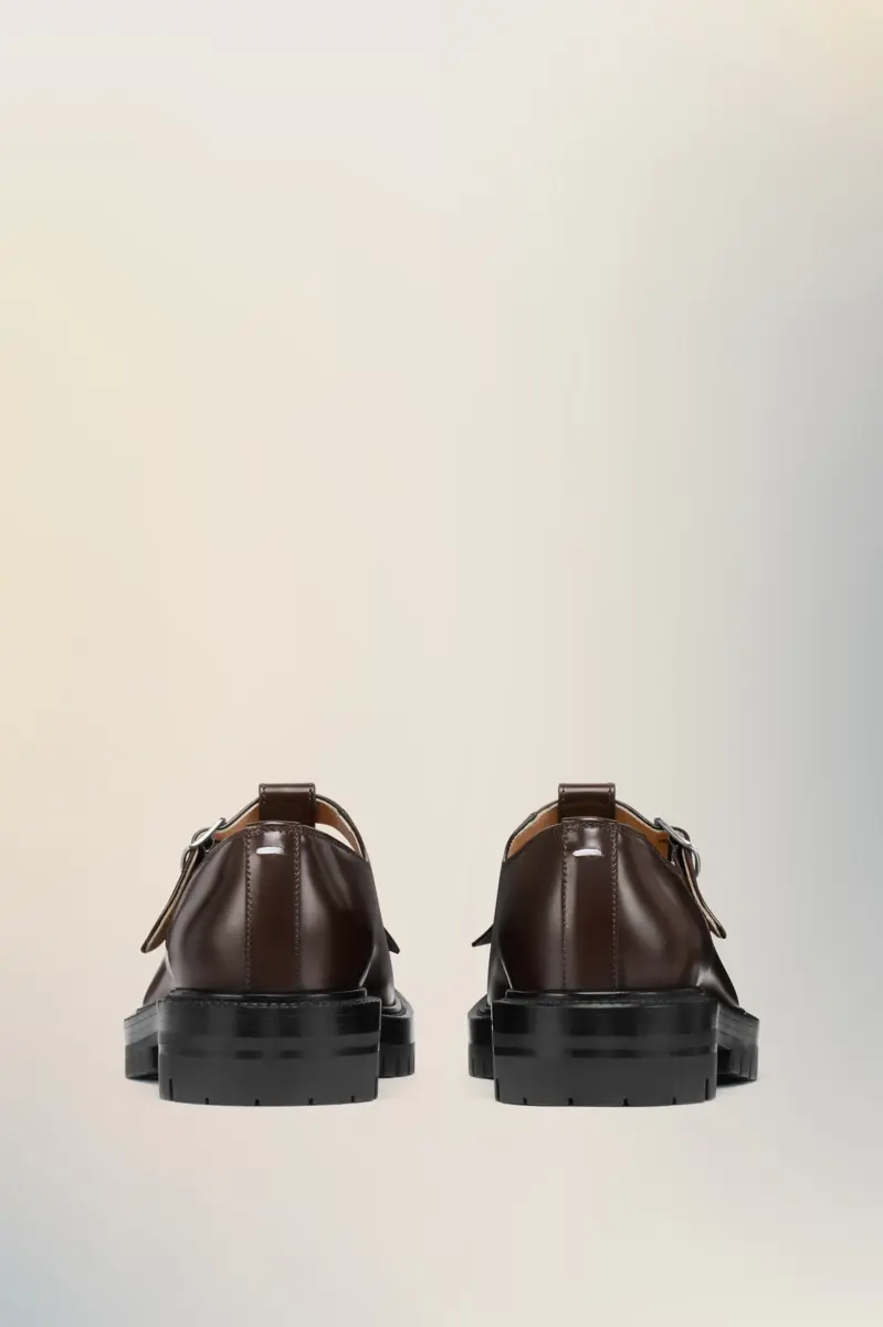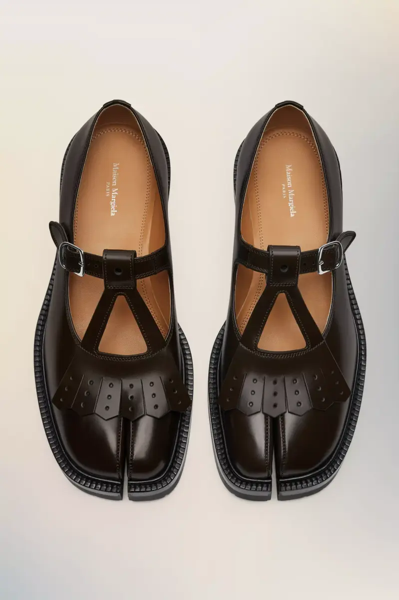 Dotate di suola con tacchetti e decorazione con frange sul davanti, le scarpe Mary-Jane sono realizzate in pelle spazzolata. Il paio presenta la punta divisa Tabi, ispirata al tradizionale calzino giapponese del XV secolo che porta lo stesso nome, lanciato per la collezione di debutto della Maison nel 1989. Cattura lo spirito avanguardista e insubordinato della Maison e si presenta come un classico della tradizione, continuamente esplorato in ogni collezione.