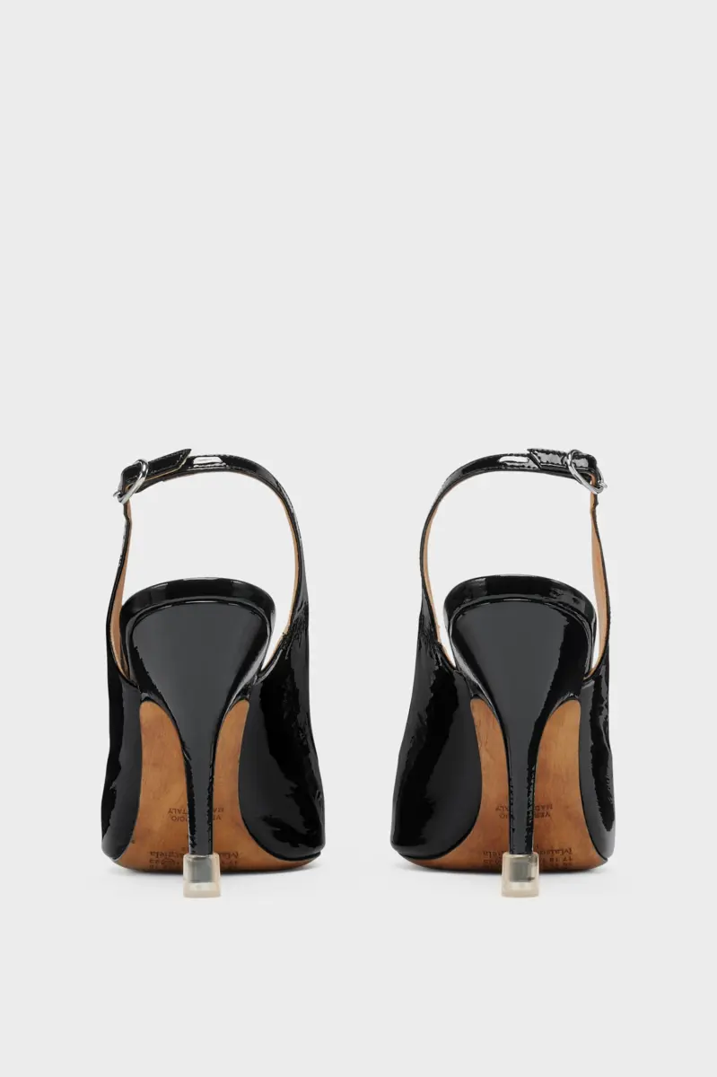 La slingback Loved to Death è realizzata in pelle di capra verniciata lucida, con dettagli modellati a mano che riflettono i segni dell’usura naturale. La silhouette strutturata è definita da una piega rivolta verso l’alto, mentre la suola in pelle di vitello è verniciata a mano e leggermente levigata per un effetto vissuto. La cucitura bianca distintiva di Maison Margiela appare sul retro.