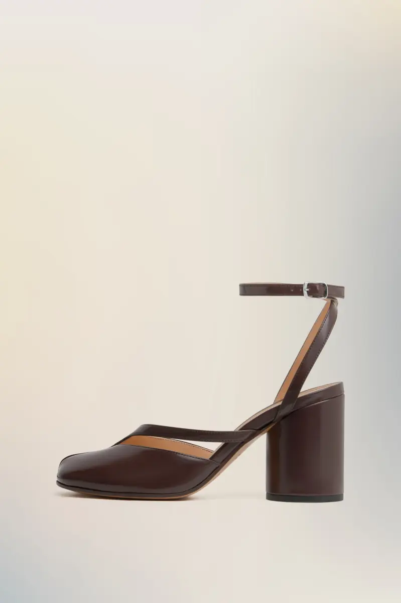 Realizzati in pelle spazzolata, i sandali cut-out presentano un tacco cilindrico di 8 cm, cinturino regolabile alla caviglia e la forma Tabi con punta divisa, ispirata al tradizionale calzino giapponese del XV secolo che porta lo stesso nome, lanciato per la collezione di debutto della Maison nel 1989. Catturano lo spirito avanguardista e insubordinato della Maison e si presentano come un classico della tradizione, continuamente esplorato in ogni collezione. La cucitura distintiva di Maison Margiela appare sul retro; l’opposto di un’etichetta.