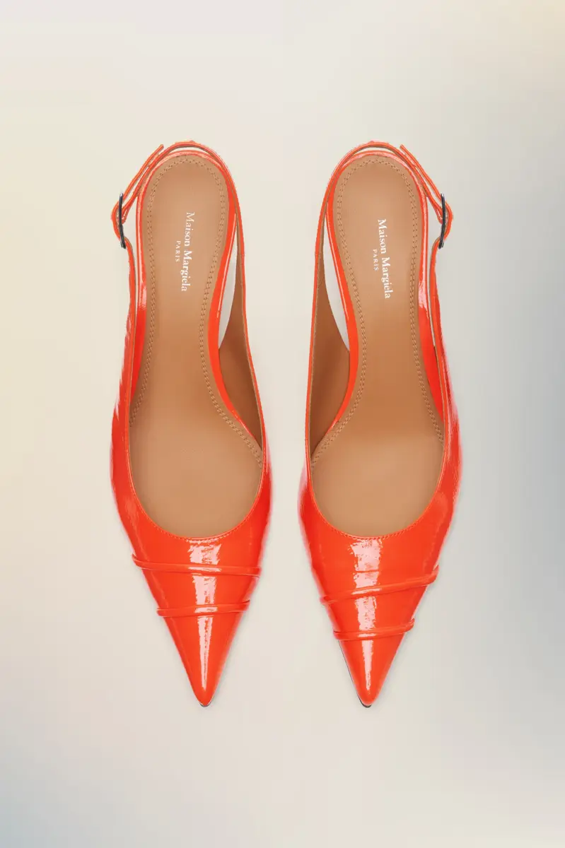 Le slingback Kinkies della Maison offrono una nuova silhouette femminile. Realizzate in morbida pelle verniciata, le scarpe presentano pieghe fatte a mano che richiamano il gesto del “ricordo”, alludendo a un movimento già amato. Sono rinforzate in gomma sulla punta per una maggiore durata e presentano un tacco di 5,5 cm. La cucitura distintiva di Maison Margiela appare sul retro.