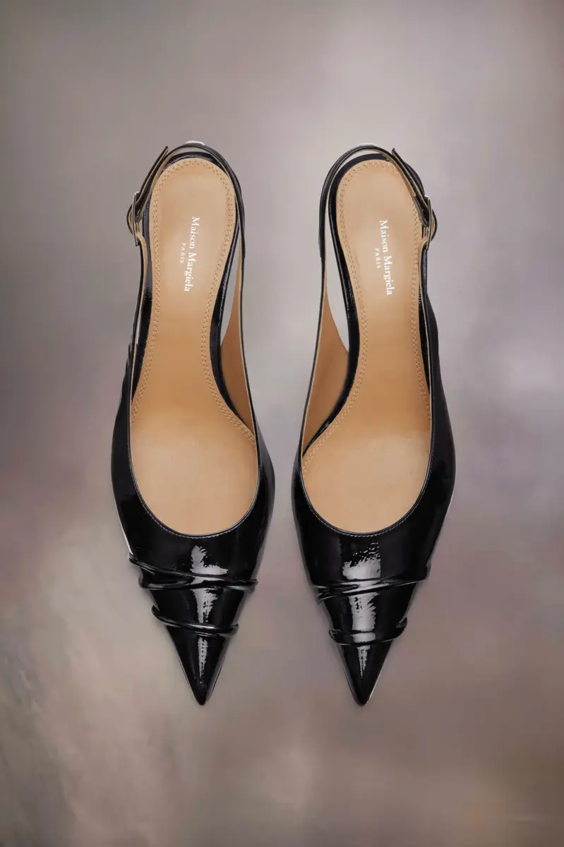 Le slingback Kinkies della Maison offrono una nuova silhouette femminile. Realizzate in morbida pelle verniciata, le scarpe presentano pieghe fatte a mano che richiamano il gesto del “ricordo”, alludendo a un movimento già amato. Sono rinforzate in gomma sulla punta per una maggiore durata e presentano un tacco di 5,5 cm. La cucitura distintiva di Maison Margiela appare sul retro.