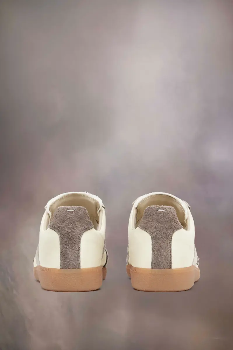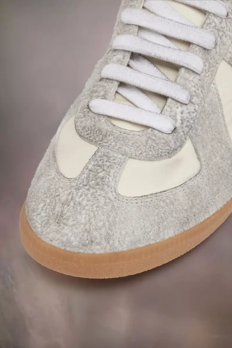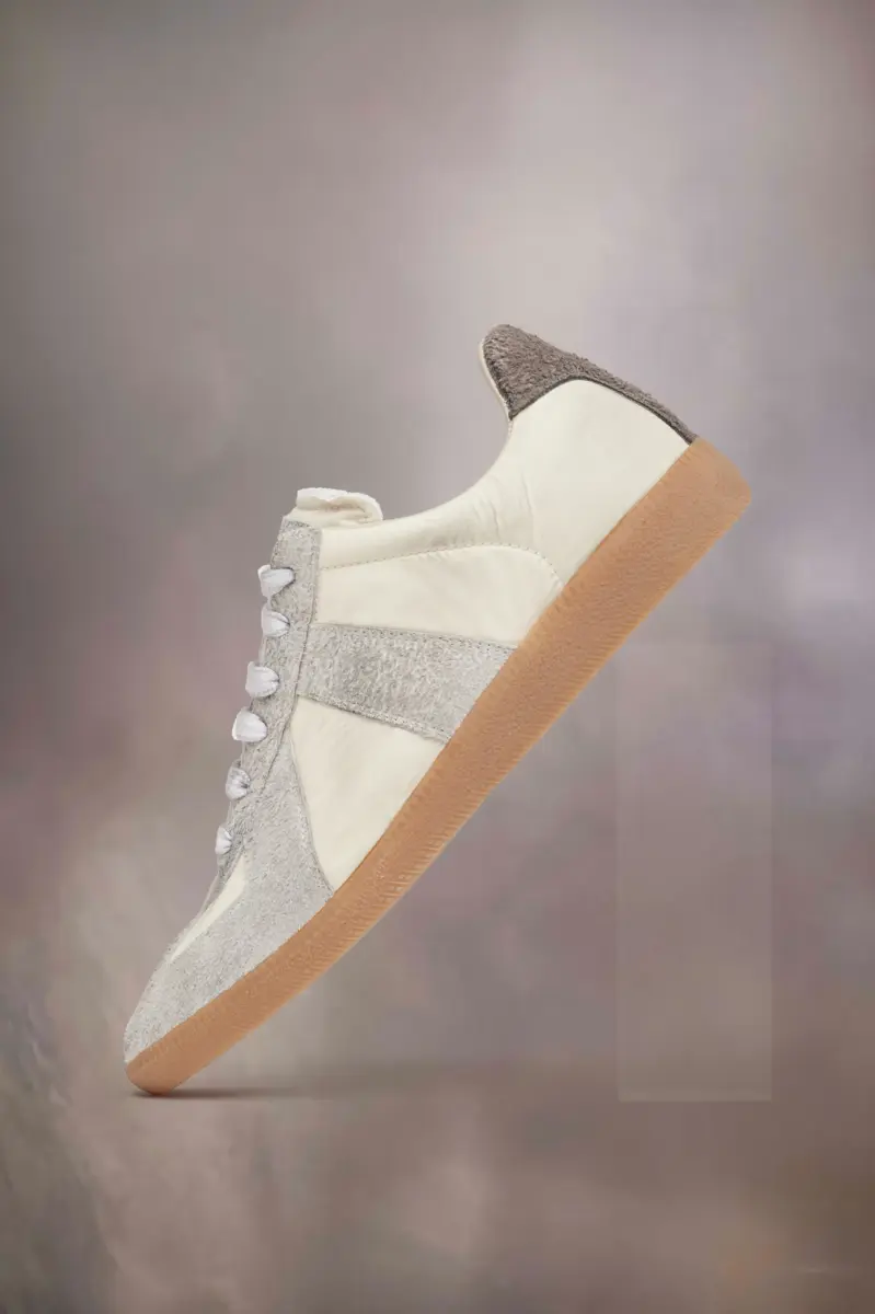 Le sneakers Replica in nylon con trattamento dirty e suede peloso sono supportate da una classica suola in gomma. L’iconico modello Replica della Maison si ispira alle scarpe sportive austriache degli anni Settanta. I dettagli delle Replica vengono continuamente rielaborati in linea con le ispirazioni della stagione. La cucitura bianca distintiva di Maison Margiela appare sul retro.