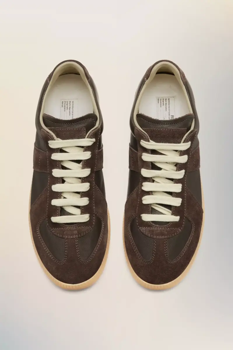 Le sneaker Replica in nappa e suede con suola color miele. Le iconiche sneaker Replica della Maison si ispirano alle scarpe sportive austriache degli anni Settanta. I dettagli delle Replica vengono continuamente rielaborati in linea con le ispirazioni della stagione.