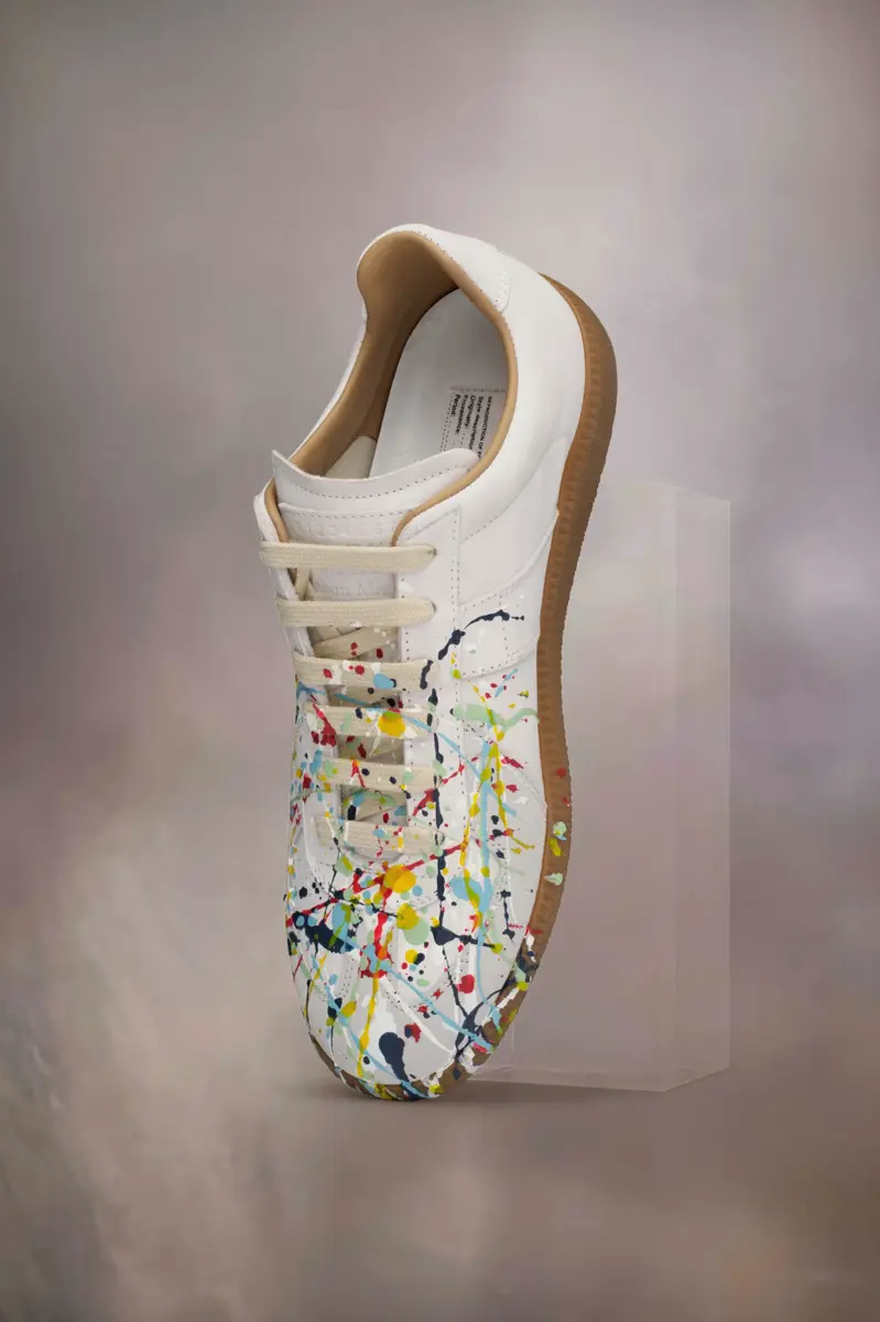 Le sneaker Replica in pelle nabuk e velluto presentano un design a schizzi di vernice. Le iconiche sneaker Replica della Maison si ispirano alle scarpe sportive austriache degli anni Settanta. I dettagli delle scarpe Replica vengono continuamente rielaborati in linea con le ispirazioni della stagione.
