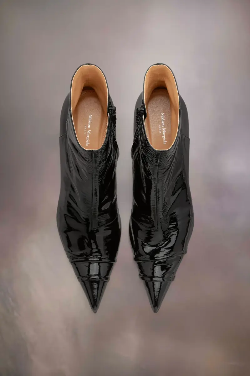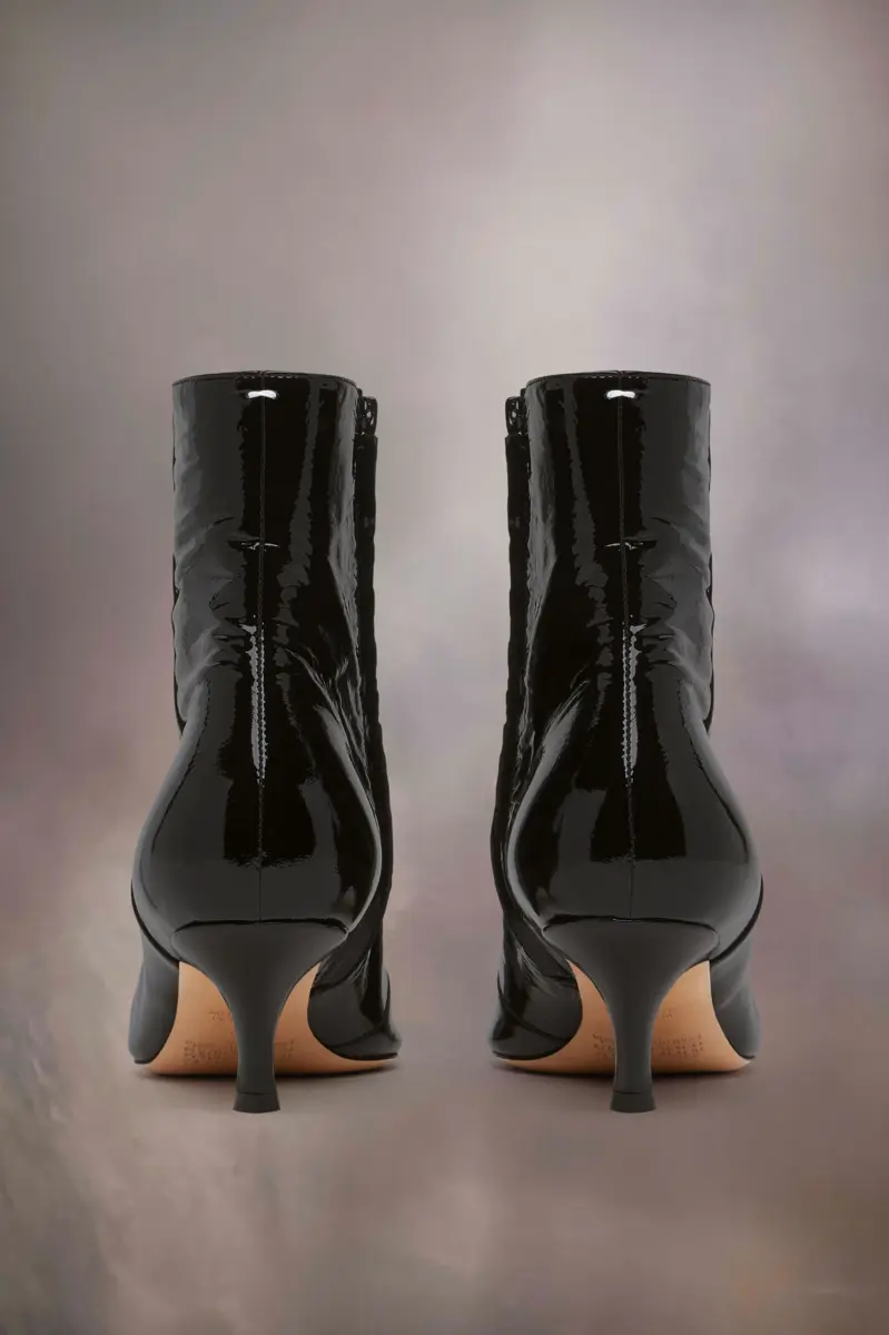 Rappresentando l’insolito o l’eccentrico, gli stivaletti Kinkies della Maison offrono una nuova silhouette femminile con un’attitudine punk. Realizzati in morbida pelle di agnello, con una texture morbida e leggermente gonfia e una finitura verniciata, gli stivali presentano pieghe fatte a mano per un tocco lussuoso e un tacco alto 5,5 cm. Sono rinforzati in gomma sulla punta per una maggiore durata e dotati di una cerniera interna per una maggiore facilità d’uso. La cucitura distintiva di Maison Margiela è presente sul retro; l’opposto di un’etichetta.