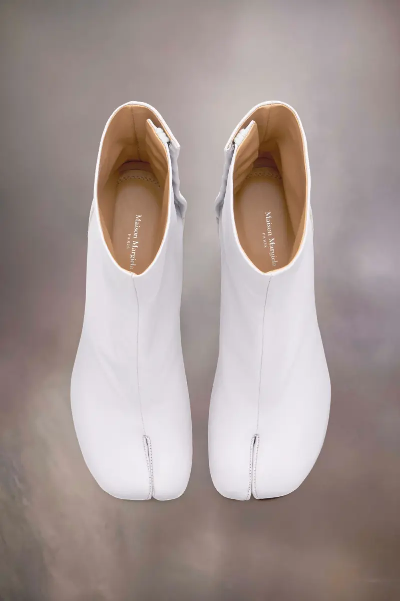 Realizzati in morbida nappa, gli stivaletti presentano un tacco cilindrico di 8 cm e la forma Tabi con punta divisa, ispirata al tradizionale calzino giapponese del XV secolo che porta lo stesso nome, lanciato per la collezione di debutto della Maison nel 1989. Cattura lo spirito avanguardista e insubordinato della Maison e si presenta come un classico della tradizione, continuamente esplorato in ogni collezione.