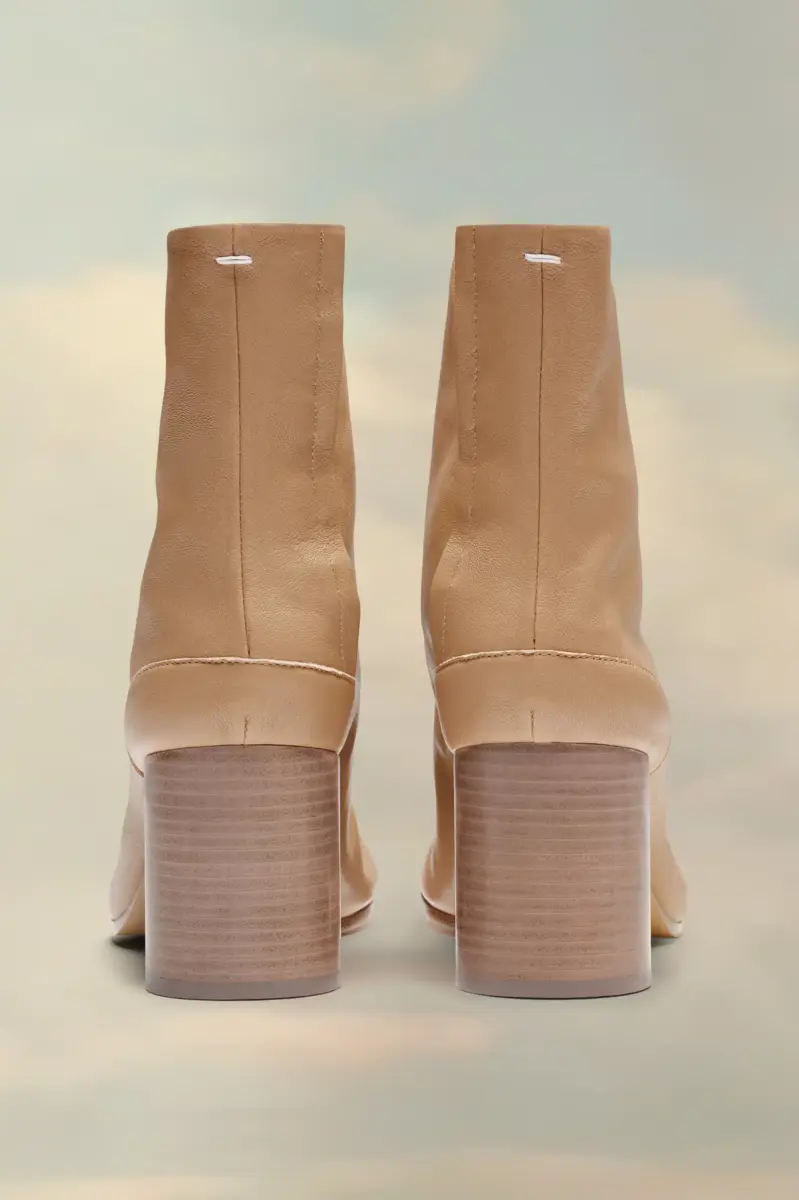 Realizzati in morbida nappa, gli stivaletti presentano un tacco cilindrico di 8 cm e la forma Tabi con punta divisa, ispirata al tradizionale calzino giapponese del XV secolo che porta lo stesso nome, lanciato per la collezione di debutto della Maison nel 1989. Cattura lo spirito avanguardista e insubordinato della Maison e si presenta come un classico della tradizione, continuamente esplorato in ogni collezione.