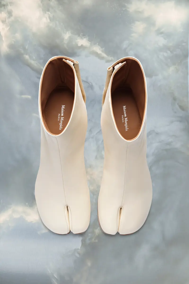 Realizzati in morbida nappa, gli stivaletti presentano un tacco cilindrico di 6 cm e la forma Tabi con punta divisa, ispirata alla tradizionale calza giapponese del XV secolo che porta lo stesso nome, lanciata per la collezione di debutto della Maison nel 1989. Cattura lo spirito avanguardista e insubordinato della Maison e si presenta come un classico della tradizione, continuamente esplorato in ogni collezione.