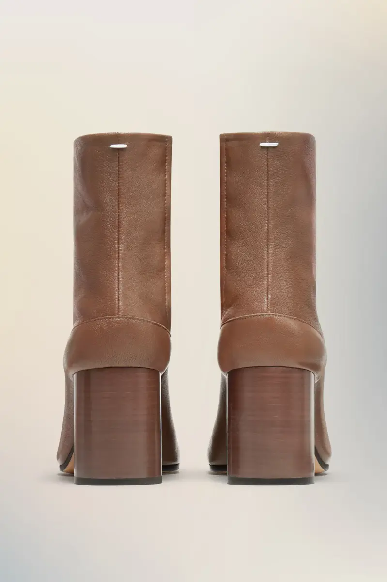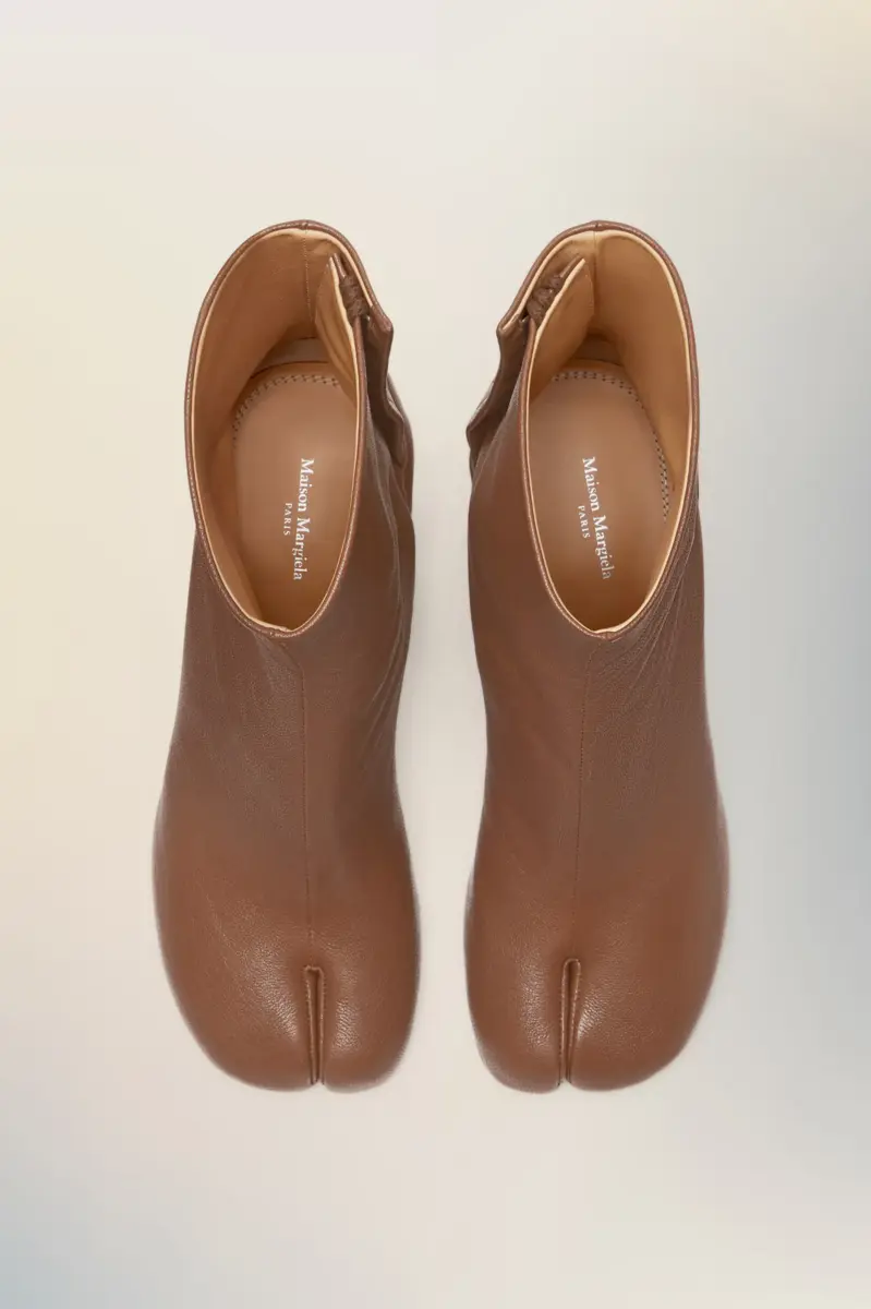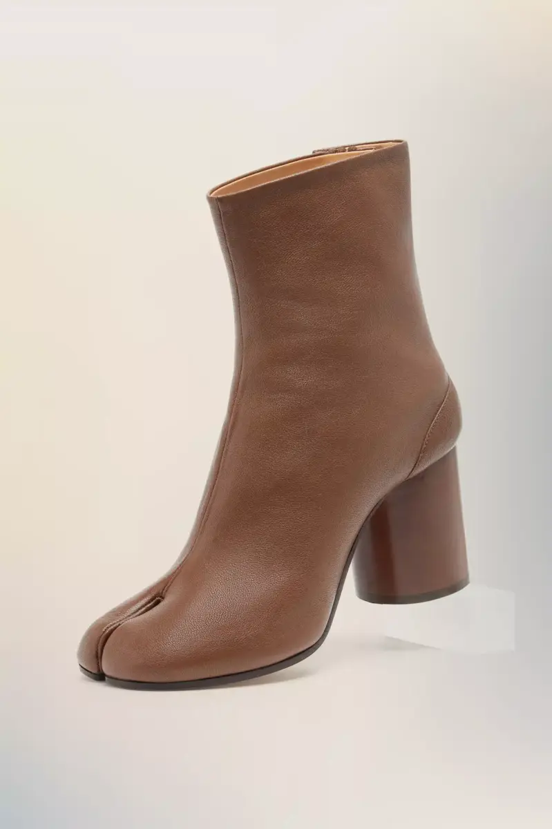 Realizzati in morbida nappa, gli stivaletti presentano un tacco cilindrico di 8 cm e la forma Tabi con punta divisa, ispirata al tradizionale calzino giapponese del XV secolo che porta lo stesso nome, lanciato per la collezione di debutto della Maison nel 1989. Cattura lo spirito avanguardista e insubordinato della Maison e si presenta come un classico della tradizione, continuamente esplorato in ogni collezione.
