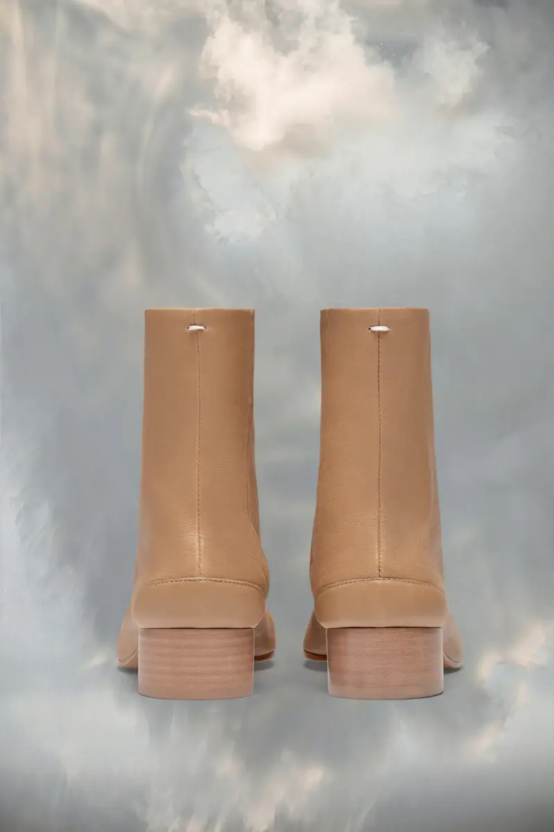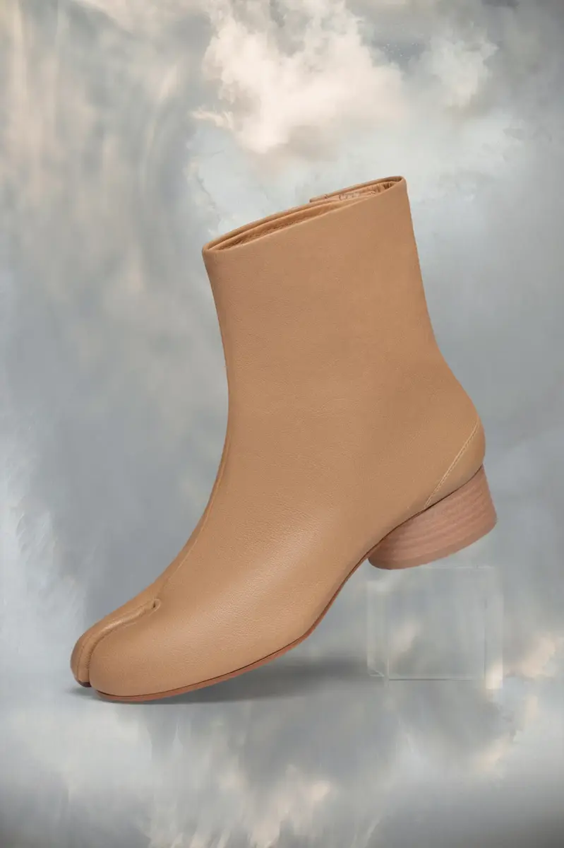 Realizzati in morbida nappa, gli stivaletti presentano un tacco cilindrico di 3 cm e la forma Tabi con punta divisa, ispirata alla tradizionale calza giapponese del XV secolo che porta lo stesso nome, lanciata per la collezione di debutto della Maison nel 1989. Cattura lo spirito avanguardista e insubordinato della Maison e si presenta come un classico della tradizione, continuamente esplorato in ogni collezione.