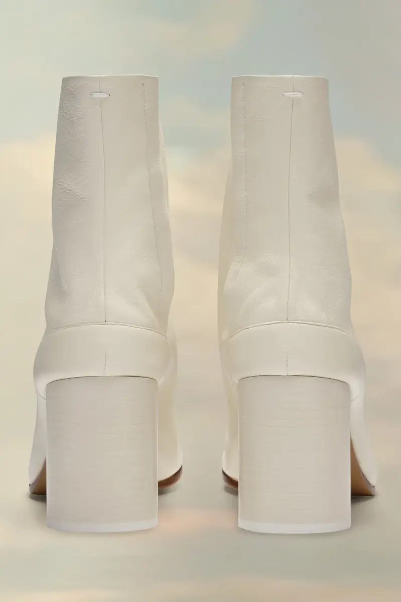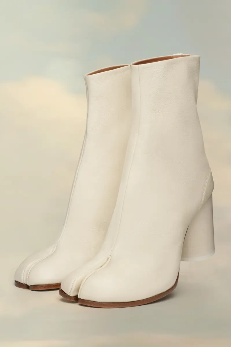 Realizzati in morbida nappa, gli stivaletti presentano un tacco cilindrico di 8 cm e la forma Tabi con punta divisa, ispirata al tradizionale calzino giapponese del XV secolo che porta lo stesso nome, lanciato per la collezione di debutto della Maison nel 1989. Cattura lo spirito avanguardista e insubordinato della Maison e si presenta come un classico della tradizione, continuamente esplorato in ogni collezione.