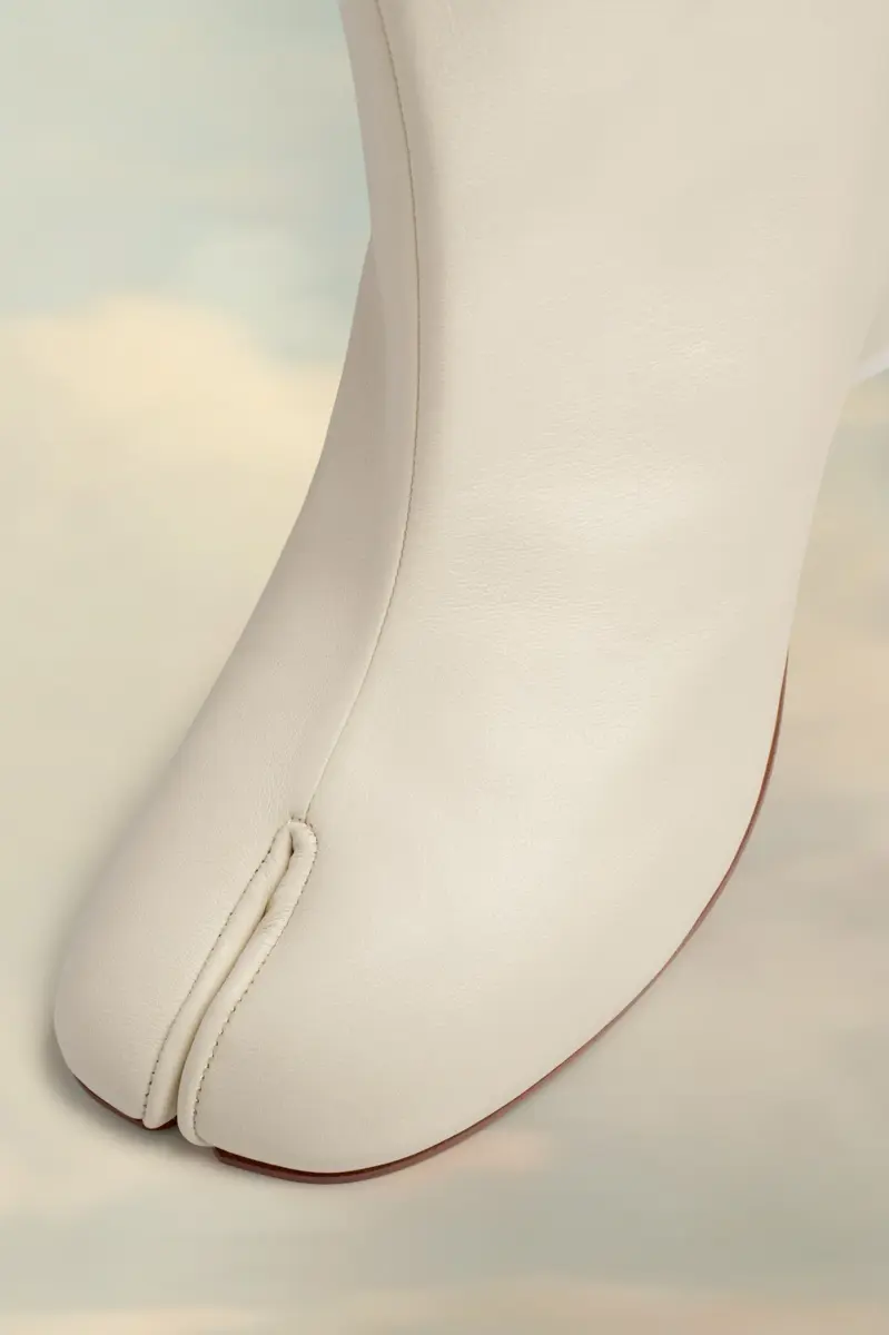 Realizzati in morbida nappa, gli stivaletti presentano un tacco cilindrico di 3 cm e la forma Tabi con punta divisa, ispirata alla tradizionale calza giapponese del XV secolo che porta lo stesso nome, lanciata per la collezione di debutto della Maison nel 1989. Cattura lo spirito avanguardista e insubordinato della Maison e si presenta come un classico della tradizione, continuamente esplorato in ogni collezione.