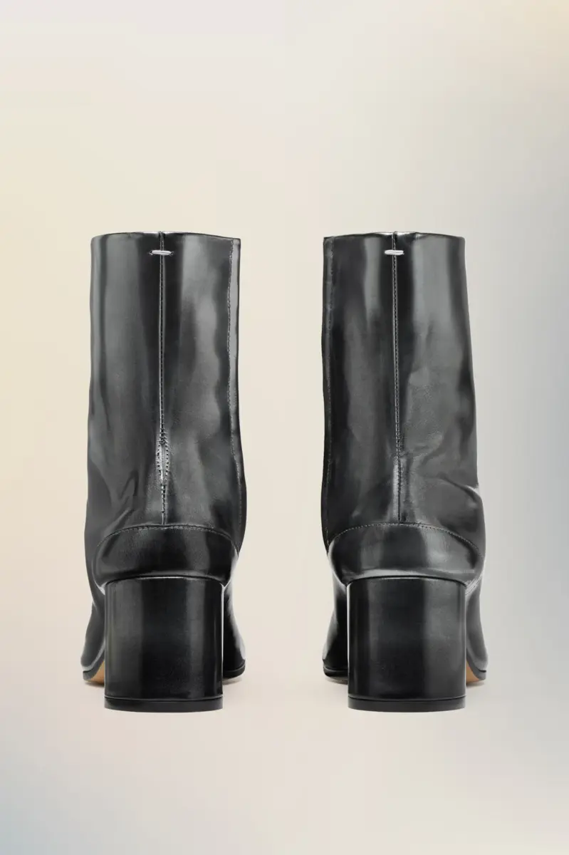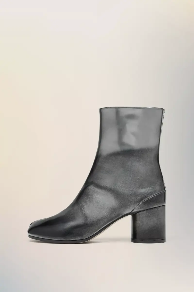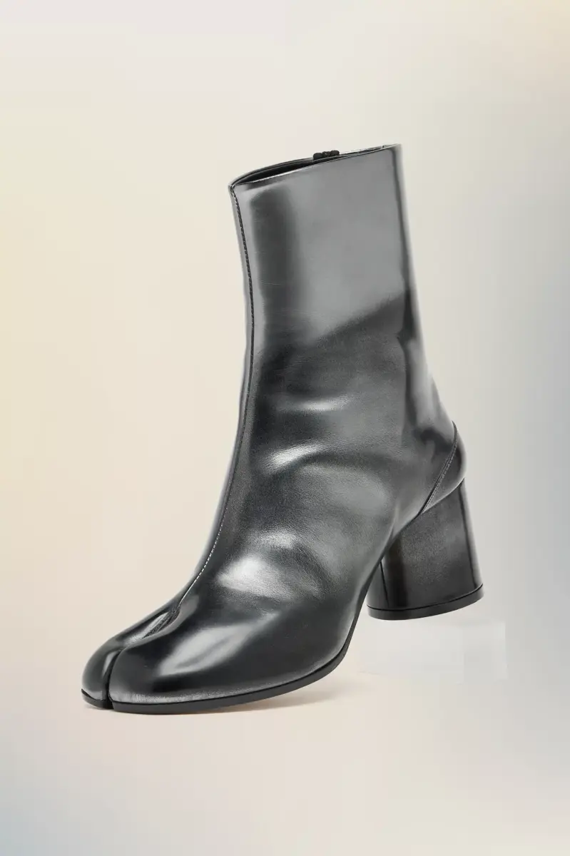 La scarpa Tabi, che prende il nome dal tradizionale calzino giapponese da cui prende forma, ha debuttato nella collezione del 1989 della Maison. Qui, è rielaborata in pelle di vitello bicolore con tacco cilindrico. Elegante ma sovversivo, lo stile è rifinito con una singola cucitura bianca sul retro.