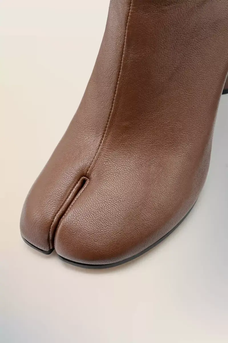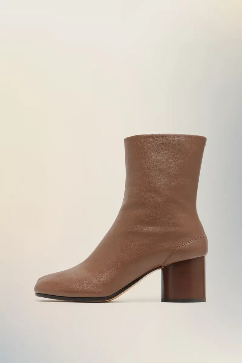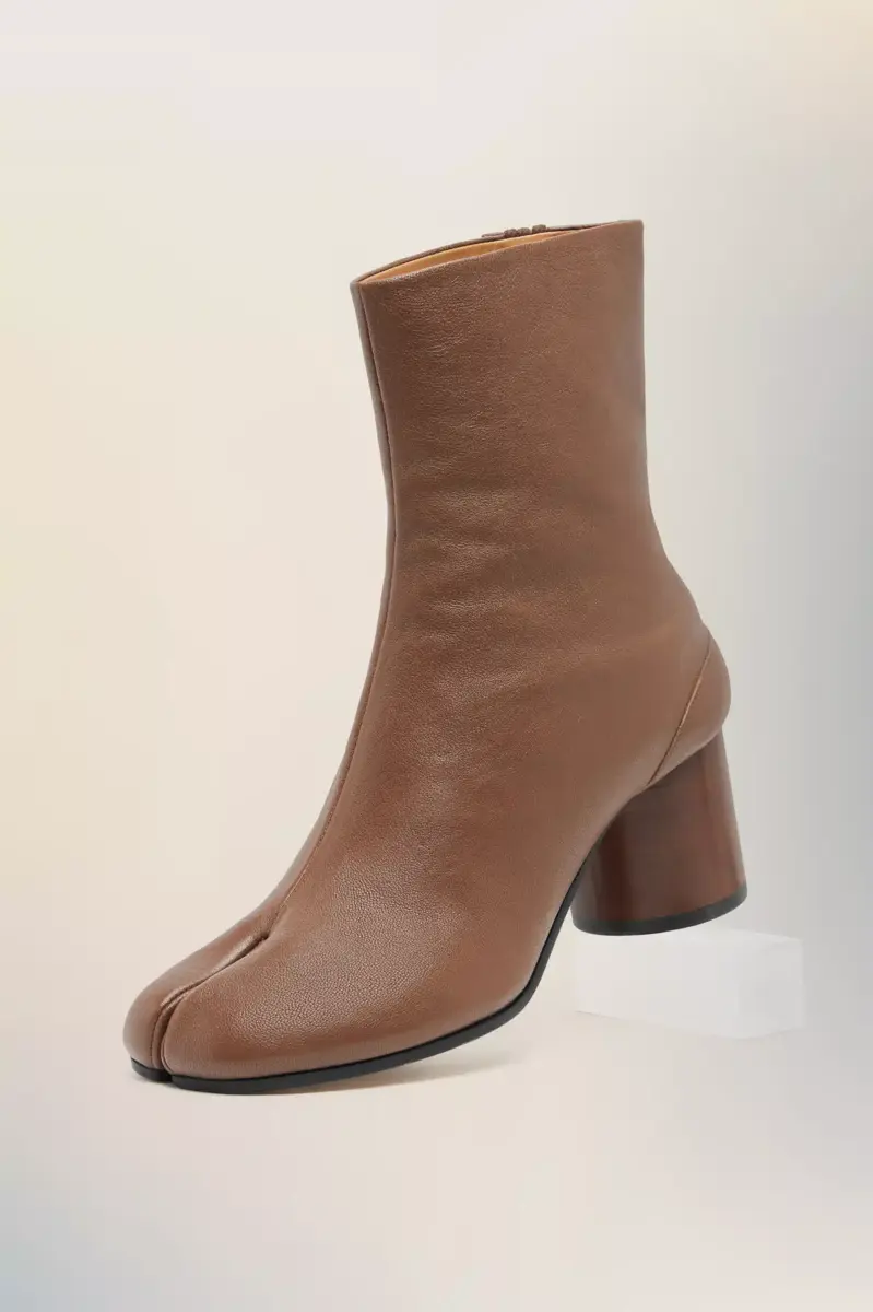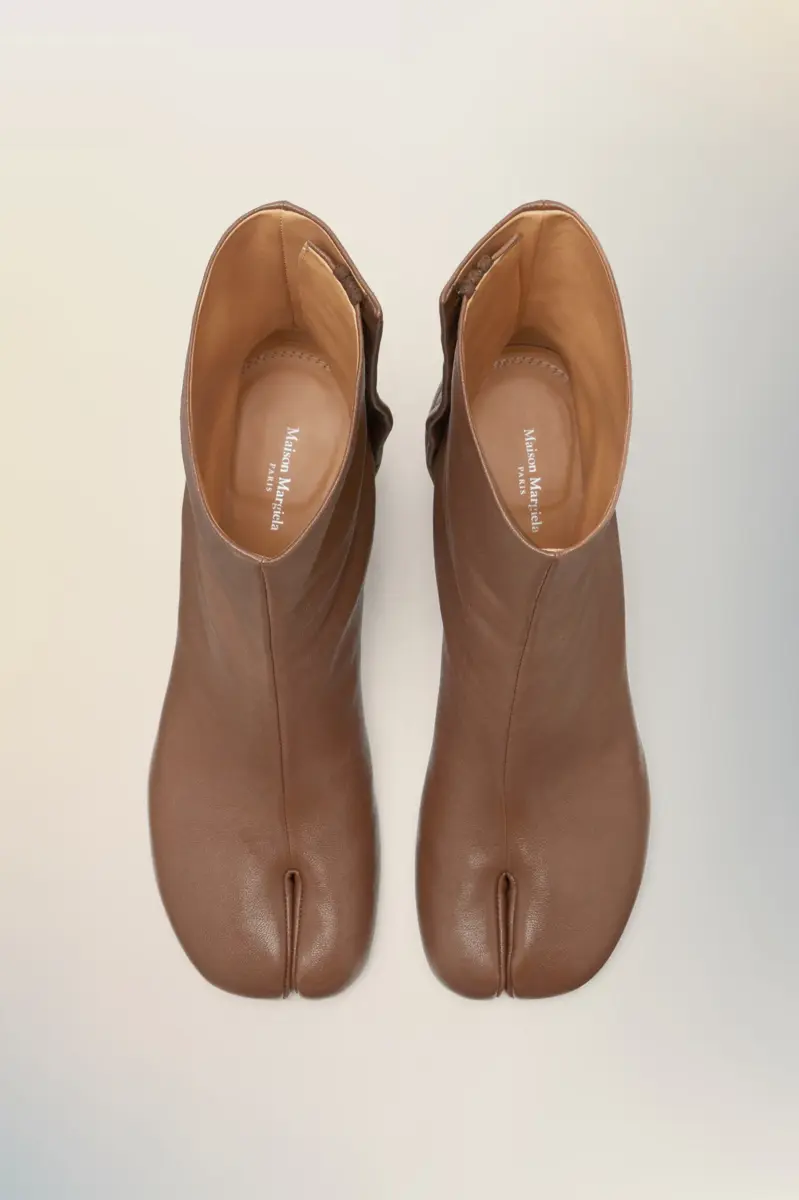 Realizzati in morbida nappa, gli stivaletti presentano un tacco cilindrico di 6 cm e la forma Tabi con punta divisa, ispirata alla tradizionale calza giapponese del XV secolo che porta lo stesso nome, lanciata per la collezione di debutto della Maison nel 1989. Cattura lo spirito avanguardista e insubordinato della Maison e si presenta come un classico della tradizione, continuamente esplorato in ogni collezione.