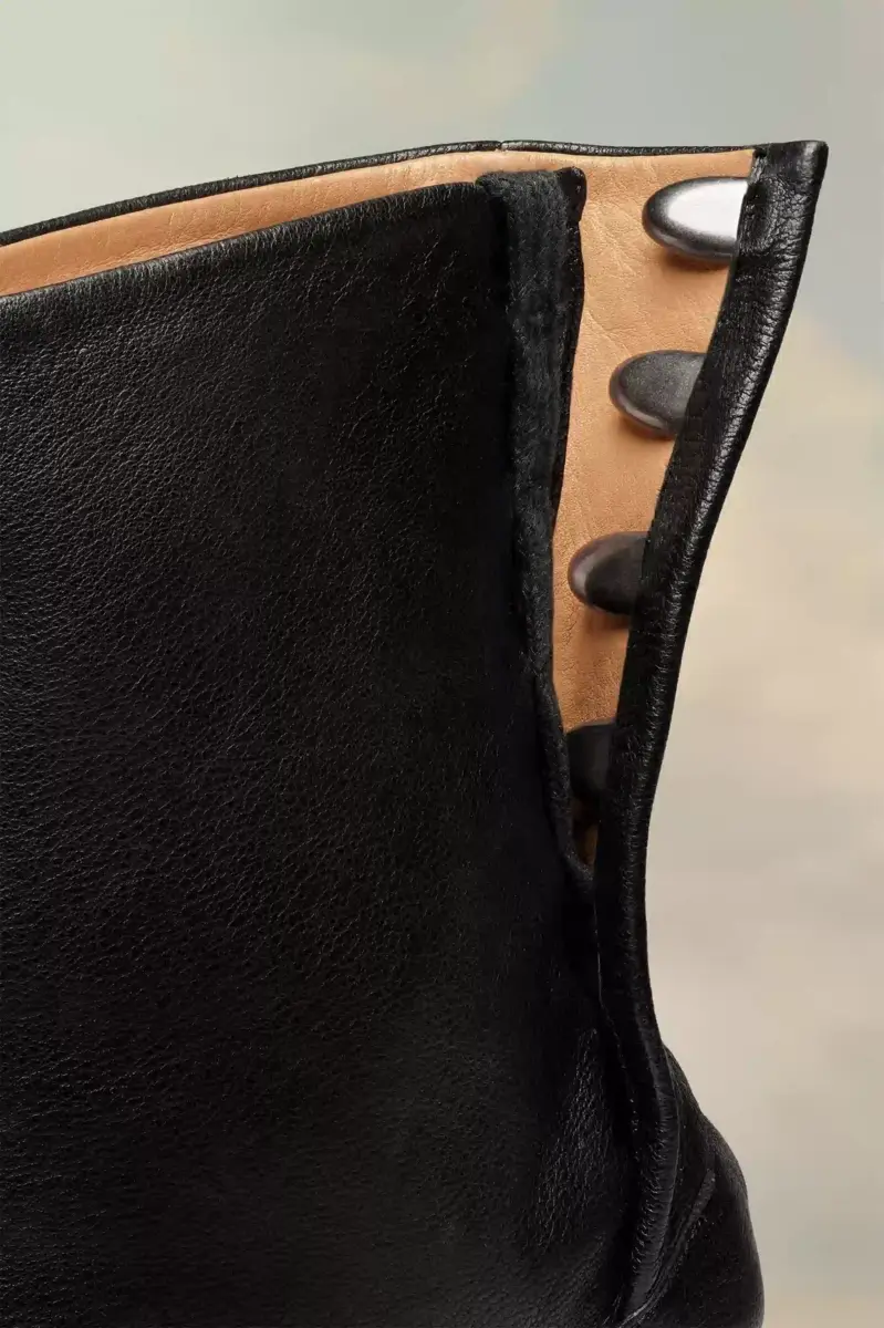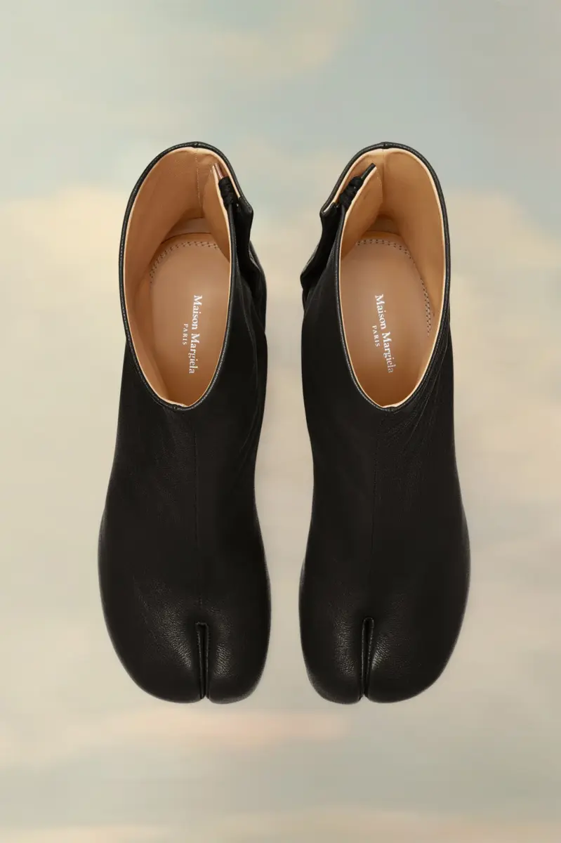 Realizzati in morbida nappa, gli stivaletti presentano un tacco cilindrico di 8 cm e la forma Tabi con punta divisa, ispirata al tradizionale calzino giapponese del XV secolo che porta lo stesso nome, lanciato per la collezione di debutto della Maison nel 1989. Cattura lo spirito avanguardista e insubordinato della Maison e si presenta come un classico della tradizione, continuamente esplorato in ogni collezione.