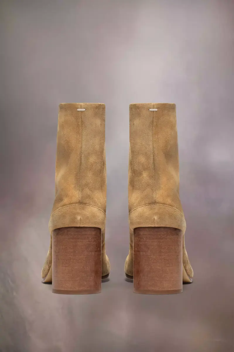 Realizzati in pelle scamosciata con trattamento used realizzato a mano, gli stivaletti hanno un tacco cilindrico di 8 cm. Il retro presenta un’unica cucitura bianca che mostra la firma di Maison Margiela. Presentano la forma Tabi con punta divisa, ispirata al tradizionale calzino giapponese del XV secolo che porta lo stesso nome, lanciato per la collezione di debutto della Maison nel 1989. Cattura lo spirito avanguardista e insubordinato della Maison e si presenta come un classico della tradizione, continuamente esplorato in ogni collezione.
