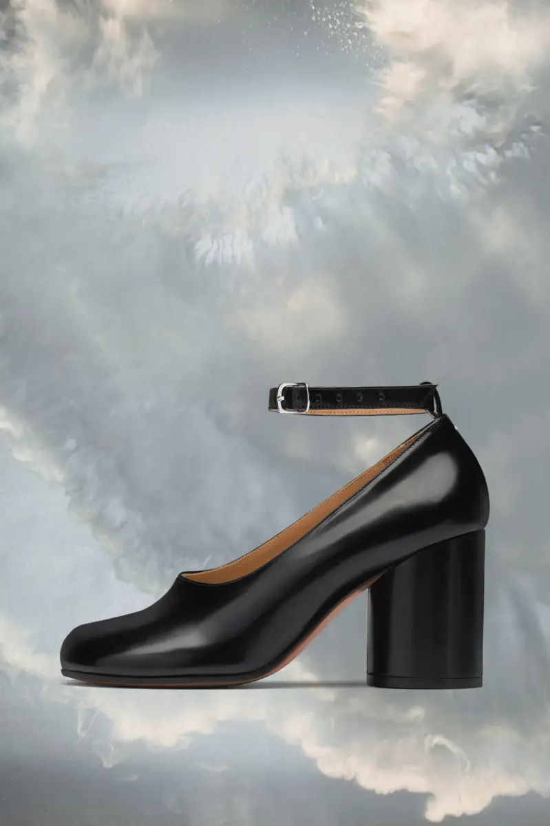 Realizzate in pelle spazzolata, queste scarpe con tacco a blocco presentano un cinturino sottile regolabile alla caviglia e la caratteristica cucitura sul retro. Presentano la punta divisa Tabi, ispirata al tradizionale calzino giapponese del XV secolo che porta lo stesso nome, lanciato per la collezione di debutto della Maison nel 1989. Cattura lo spirito avanguardista e insubordinato della Maison e si presenta come un classico della tradizione, continuamente esplorato in ogni collezione.