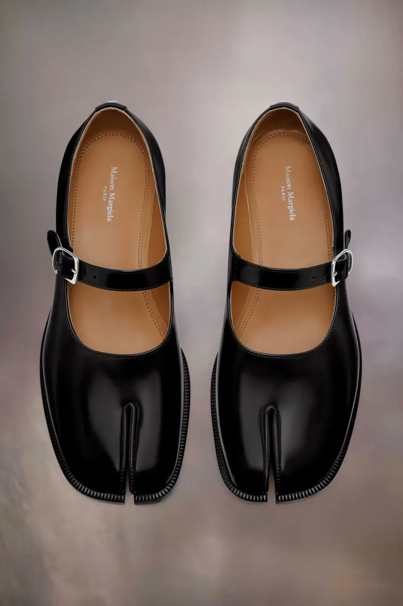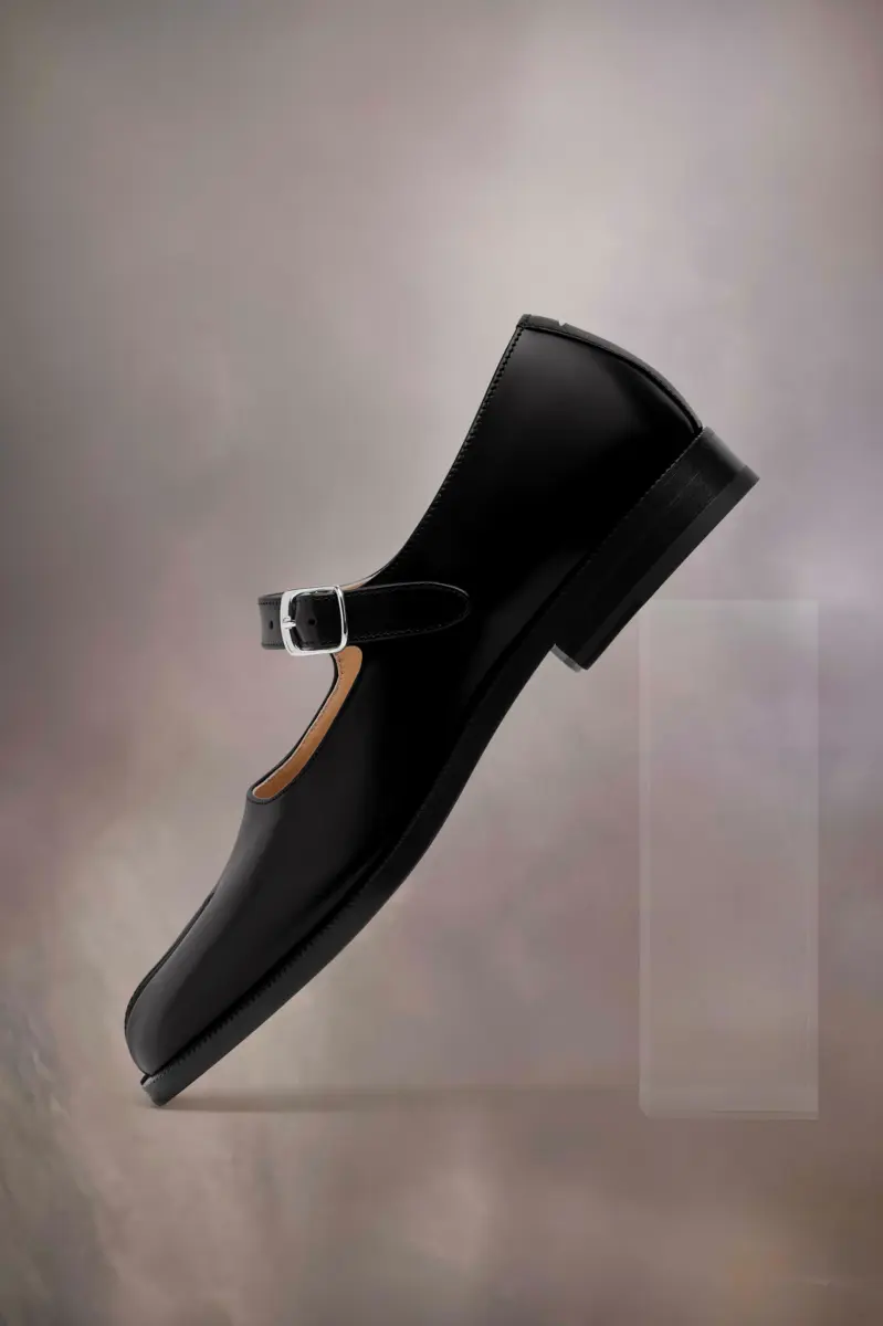 Le Tabi Mary-Jane sono realizzate in pelle spazzolata con cinturino regolabile sul piede e suola piatta. Presentano la punta divisa Tabi, ispirata al tradizionale calzino giapponese del XV secolo che porta lo stesso nome, lanciato per la collezione di debutto della Maison nel 1989. Cattura lo spirito avanguardista e insubordinato della Maison e si presenta come un classico della tradizione, continuamente esplorato in ogni collezione.