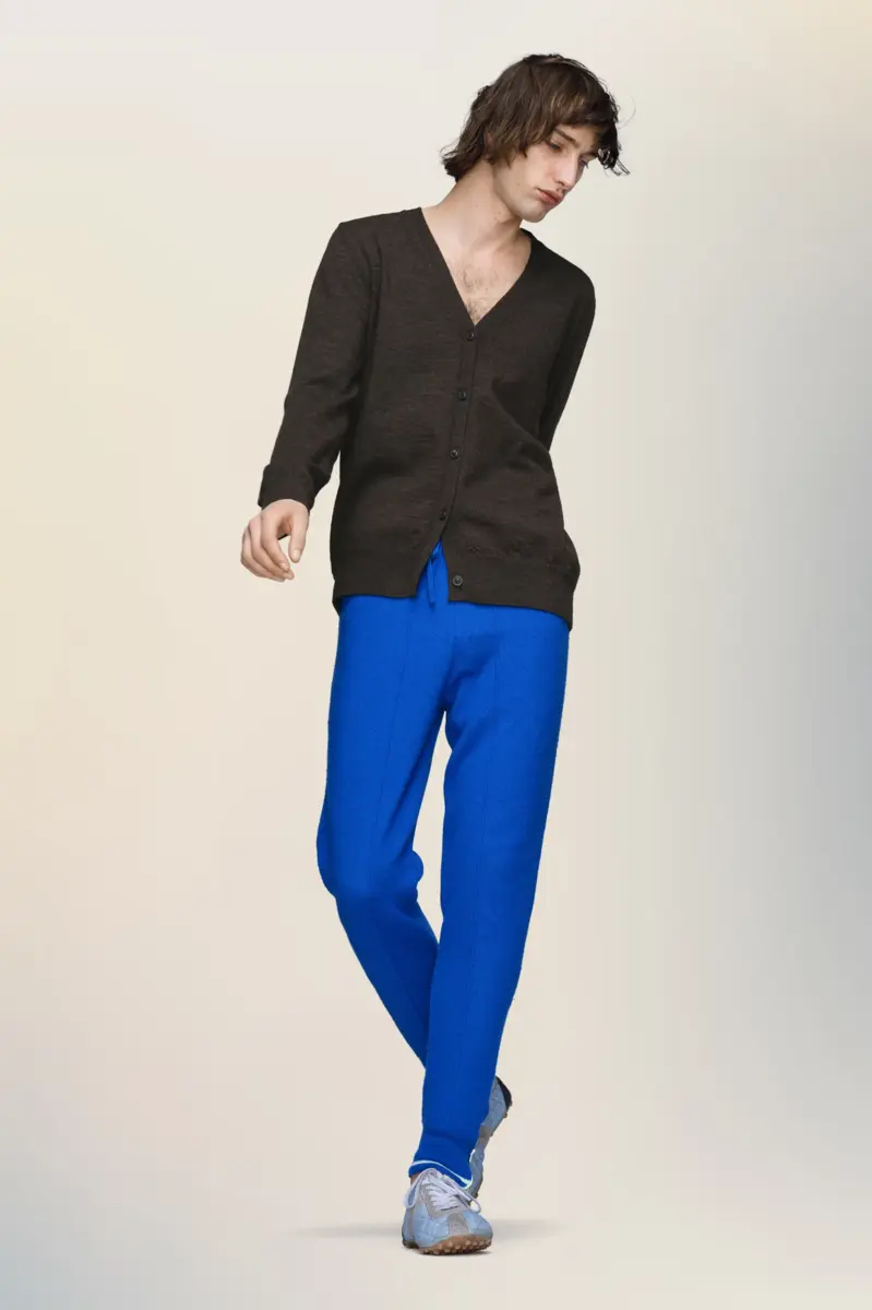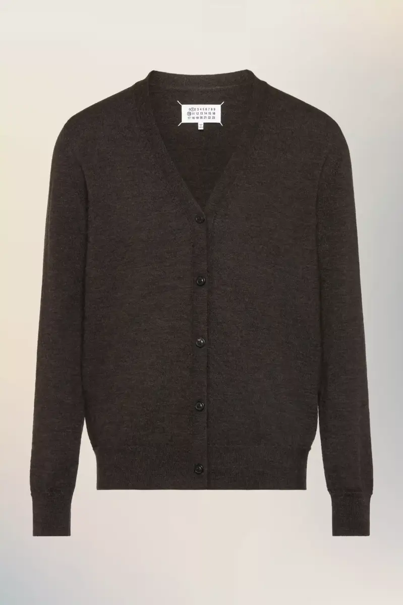 Il cardigan è realizzato in lana e presenta maniche lunghe, scollo a V e finiture a costine. Con bottoni tono su tono, da indossare aperto o chiuso, fa parte di una collezione più ampia di maglie in lana leggere e classiche da uomo. Il cardigan è impreziosito dalle toppe sui gomiti della Maison, con un effetto leggermente vissuto. La firma di Maison Margiela, i quattro punti, è visibile sul retro, l’opposto di un’etichetta.