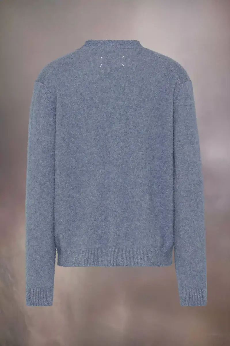 Realizzato in un misto lana e cotone Shetland, il cardigan è volutamente pilling per evocare una nostalgia vissuta. Presenta uno scollo a V profondo, spalle scese e bottoni rotondi, con dettagli a coste su polsini e orlo per una maggiore consistenza. Il volume ampio si ispira all’abbigliamento outdoor tradizionale britannico. La firma di Maison Margiela, i quattro punti, è visibile sul retro, l’opposto di un’etichetta.