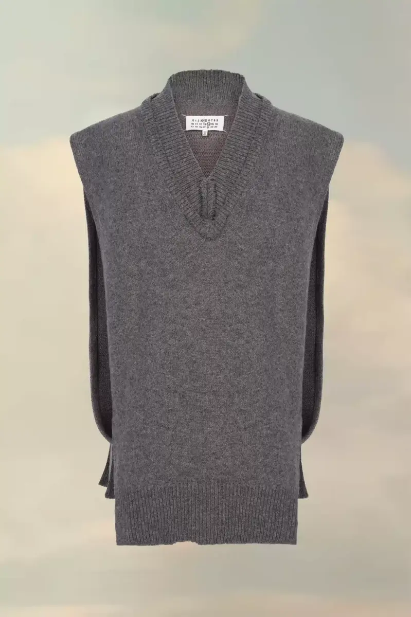 Questo gilet oversize in jersey presenta uno scollo a V a strati e finiture a costine per una maggiore texture. Sul retro, quattro cuciture bianche mostrano la firma della Maison: l’opposto di un’etichetta. Finezza 5.