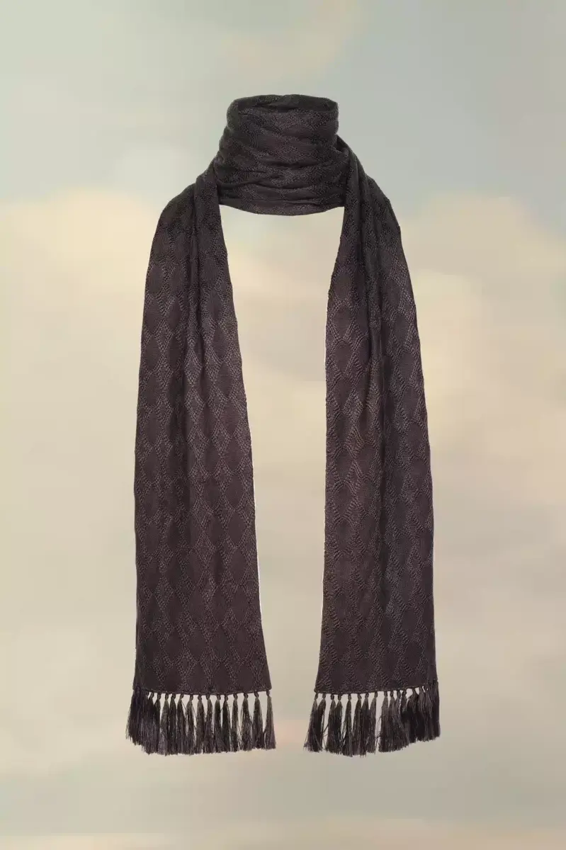 Una lunga sciarpa in maglia a rombi con dettagli in nappa. Finezza 12.