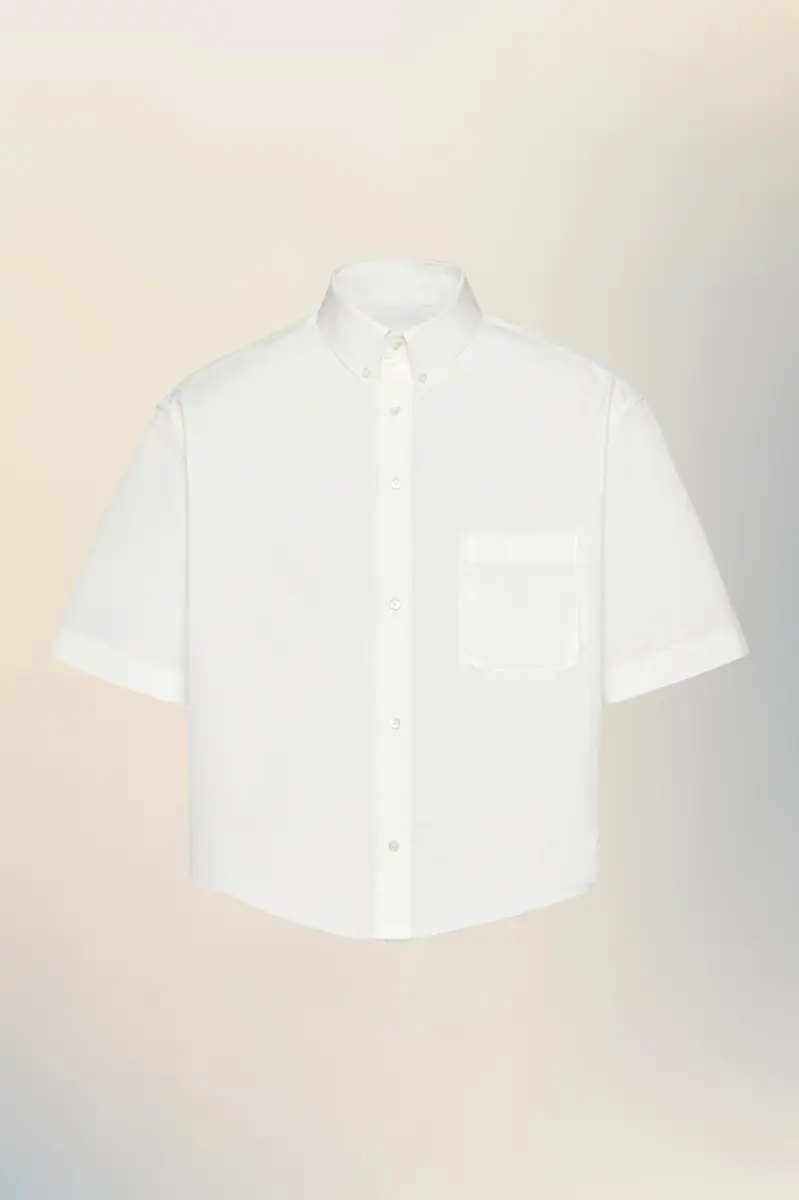 Questa camicia in cotone è realizzata all’insegna della semplicità, con lunghezza corta, orlo grezzo e taschino sul petto con motivo Decortiqué rovesciato. La finitura a vista interrompe le linee pulite, lasciando intravedere la costruzione del capo. La firma di Maison Margiela, i quattro punti, è visibile sul retro, l’opposto di un’etichetta.
