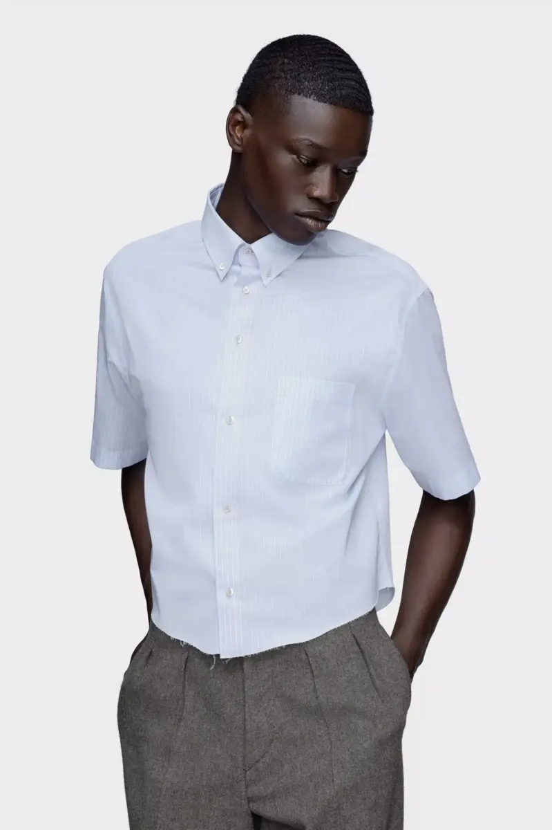 Questa camicia a maniche corte è corta e presenta un colletto classico e una tasca sul petto rovesciata con motivo Decortiqué. L’orlo a vivo introduce una sottile nota di decostruzione, offrendo un’interpretazione discretamente disfatta della camicia di tutti i giorni. La firma di Maison Margiela, i quattro punti, è visibile sul retro, l’opposto di un’etichetta.
