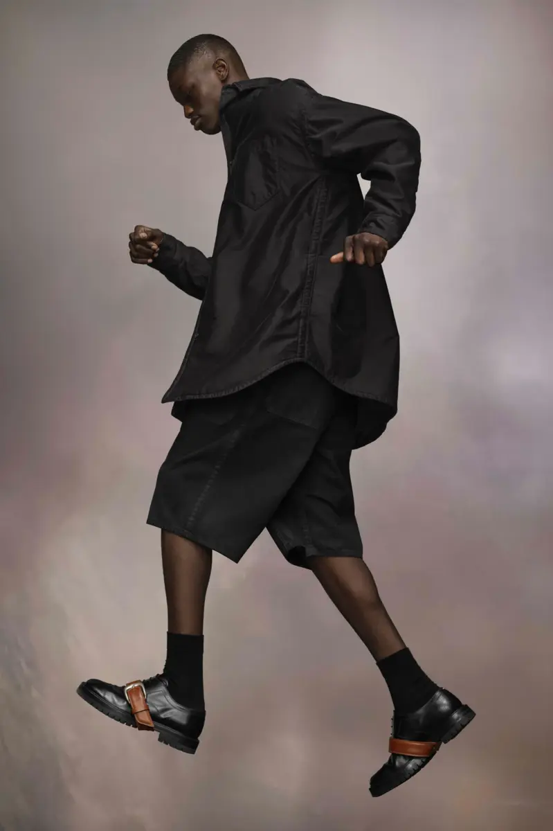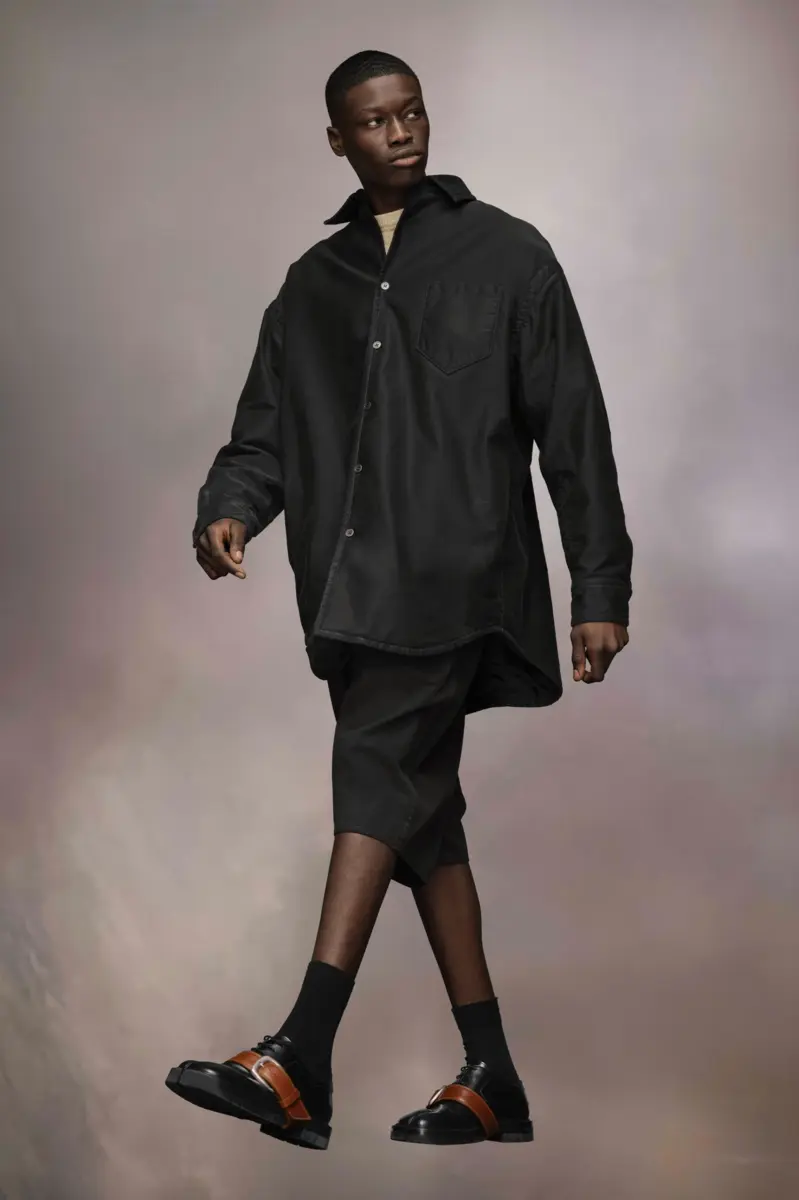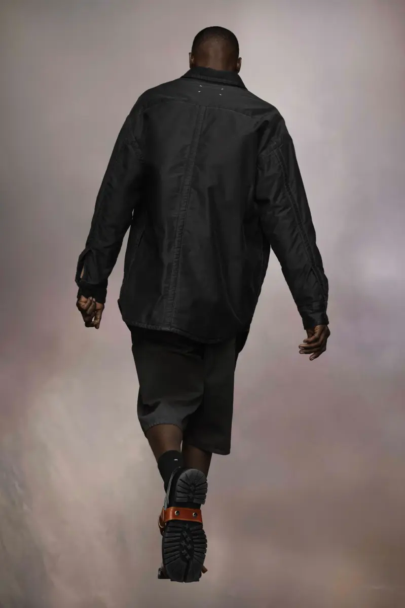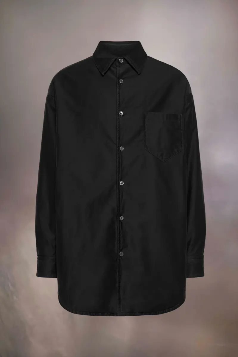 Realizzata in raso di cotone, la camicia è oversize e imbottita. È dotata di abbottonatura, colletto e taschino applicato sul petto. La firma di Maison Margiela, i Quattro punti, è presente sul retro, l’opposto di un’etichetta.