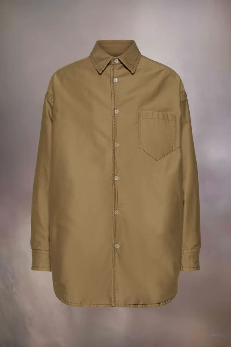 Realizzata in raso di cotone, la camicia è oversize e imbottita. È dotata di abbottonatura, colletto e taschino applicato sul petto. La firma di Maison Margiela, i Quattro punti, è presente sul retro, l’opposto di un’etichetta.