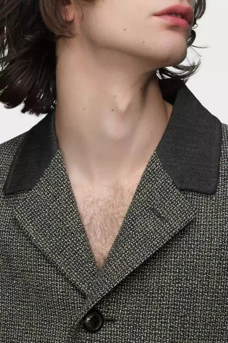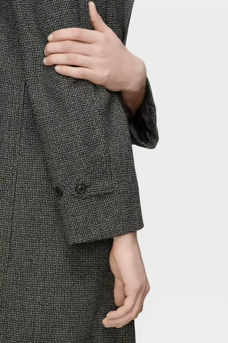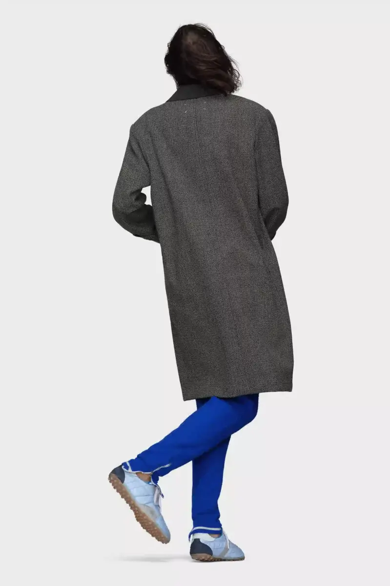 Questo cappotto monopetto in misto lana riflette l’approccio raffinato della collezione alla sartorialità. Equilibra spalle strutturate, revers a lancia e quattro bottoni frontali, creando una silhouette composta e disciplinata. La firma di Maison Margiela, i quattro punti, è visibile sul retro, l’opposto di un’etichetta.