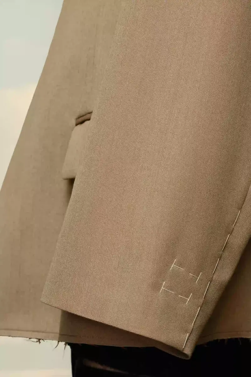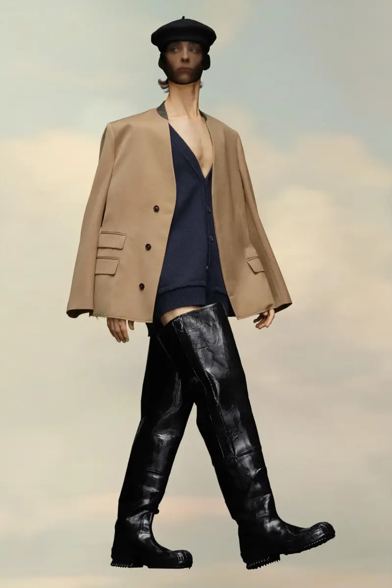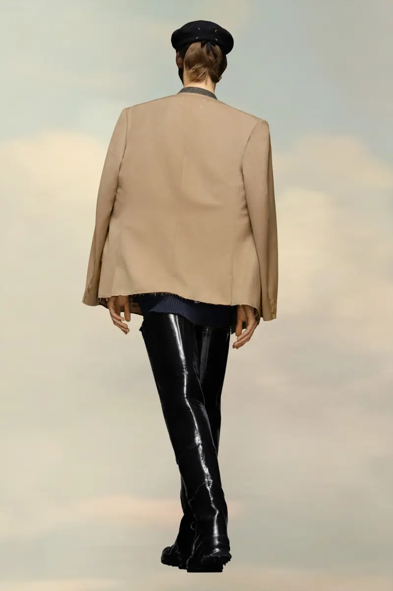 Blazer in lana con collo alla coreana e tasche asimmetriche. Presenta un colletto a contrasto, il ricordo dei polsini e quattro impunture bianche sul retro che mostrano la firma della Maison: l’opposto di un’etichetta.