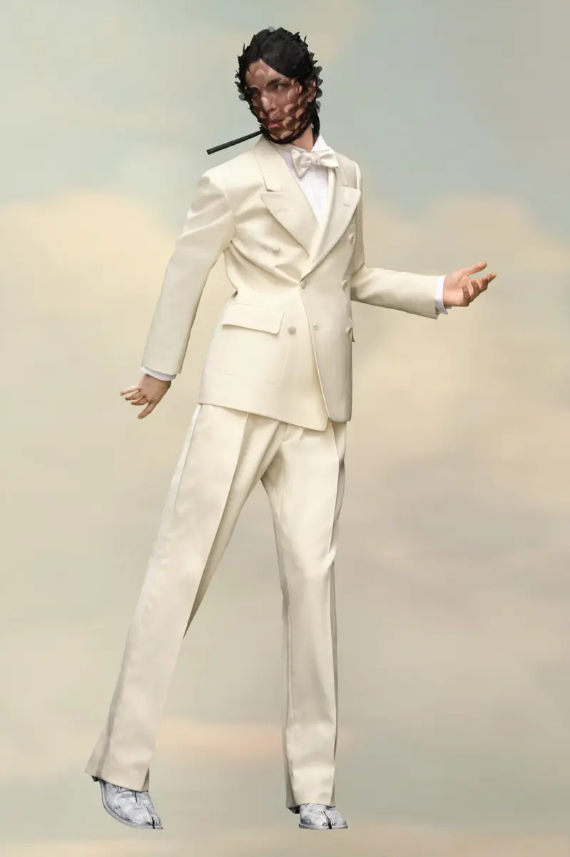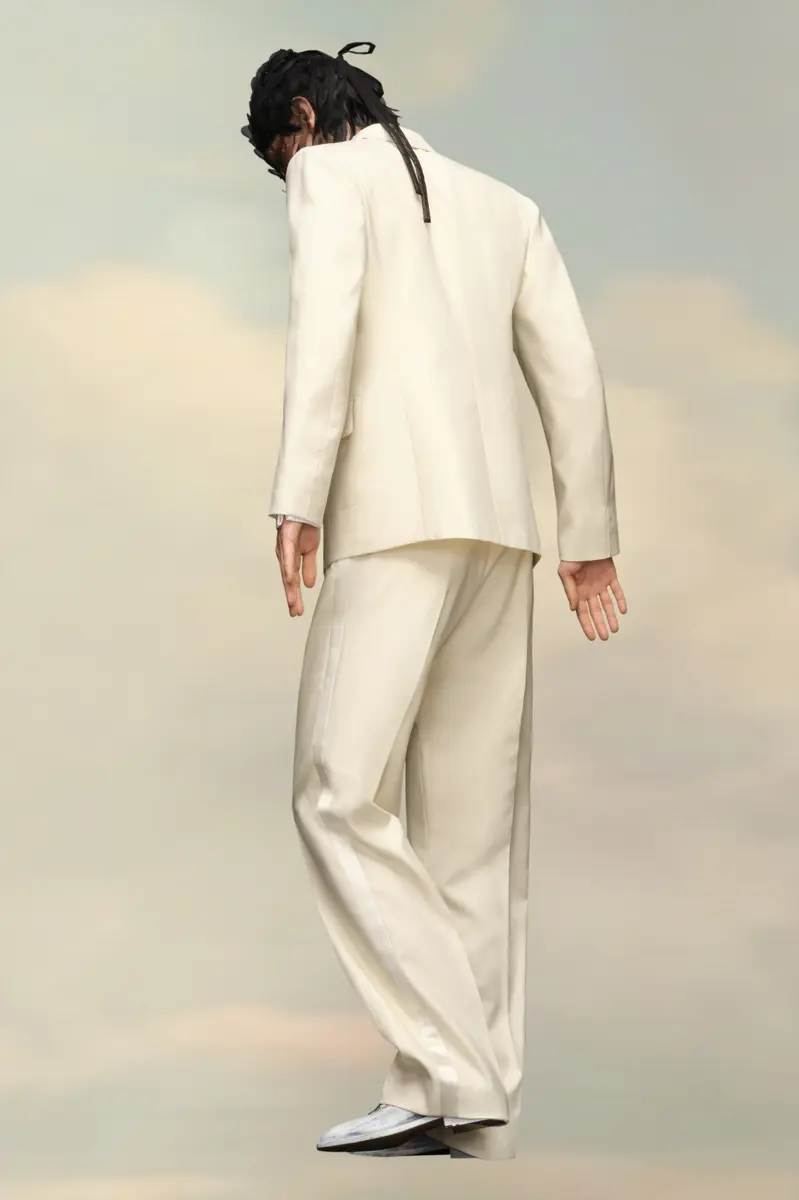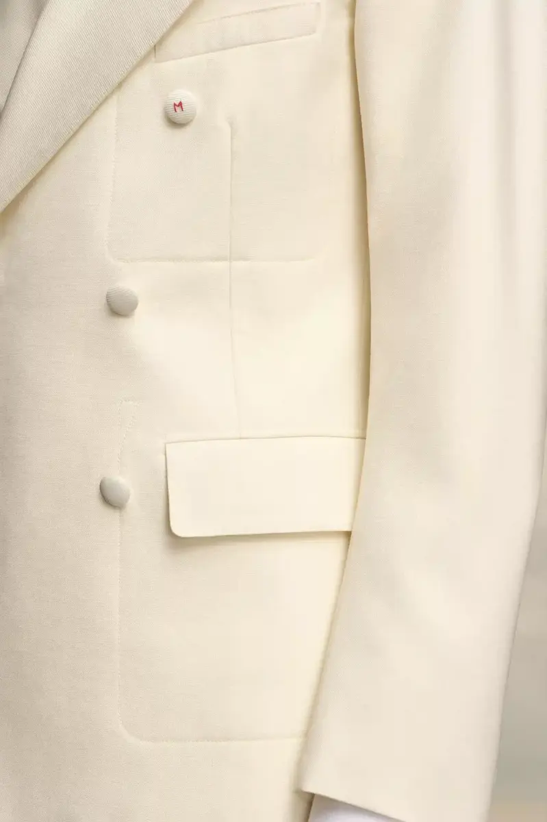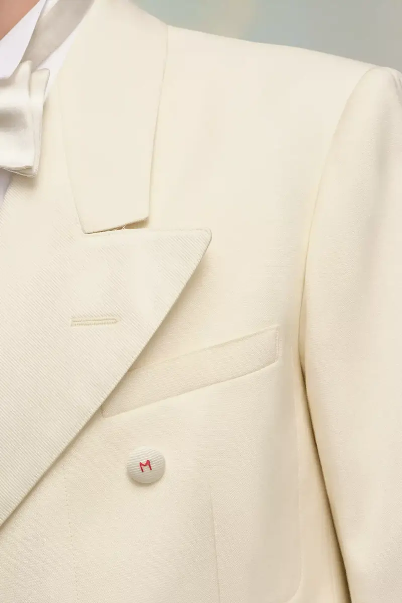 In popeline di seta mohair, questo blazer doppiopetto presenta bottoni tono su tono e un bottone a M asimmetrico. Con colletto a lancia e tasche con patta, crea una silhouette classica.