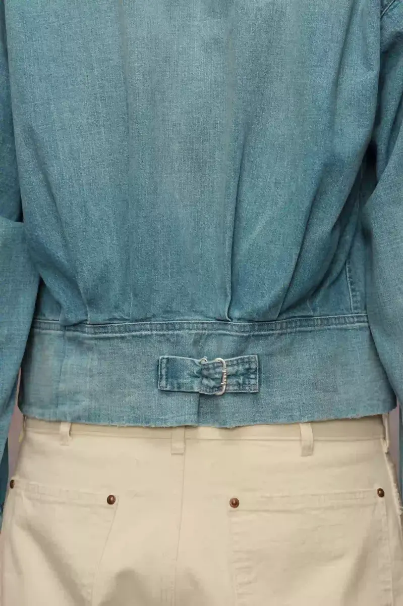Con tasche asimmetriche, tra cui una tasca sul petto con fodera anonima, la giacca caban è realizzata in denim. Presenta bottoni per la chiusura, piccoli spacchi ai polsi e un colletto elegante. Il retro presenta un design plissettato e una fibbia decorativa in vita. La firma di Maison Margiela, le quattro cuciture, è visibile sul retro, l’opposto di un’etichetta.