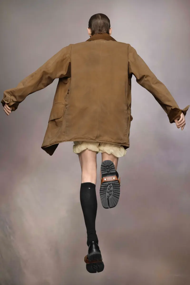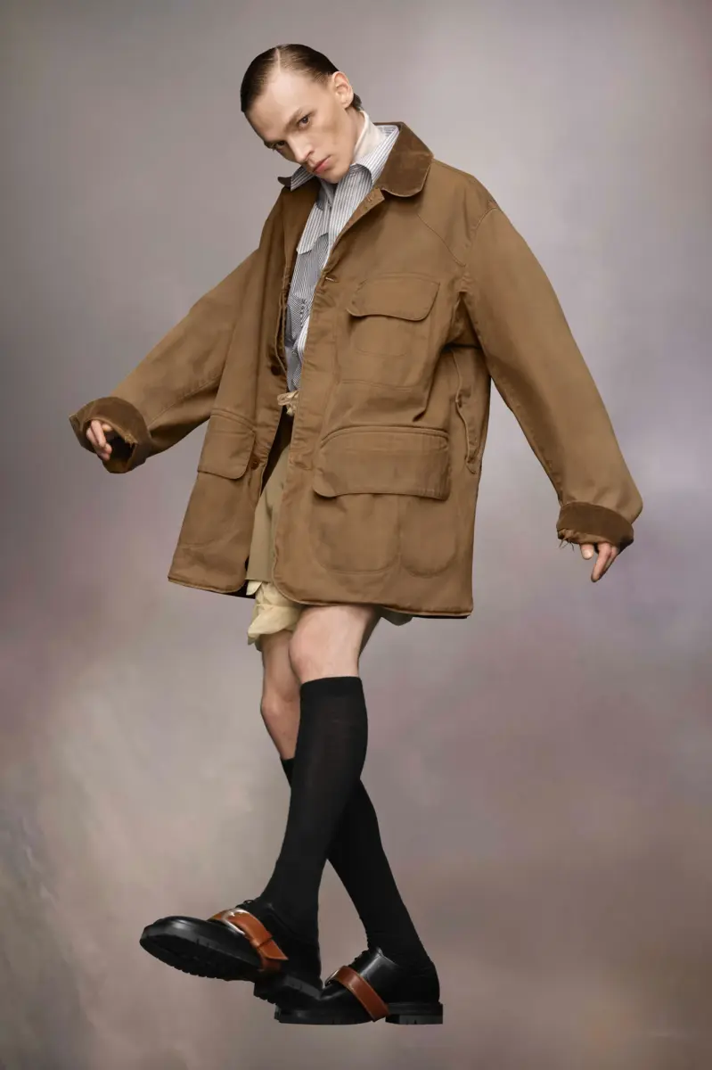 In cotone con collo in velluto a coste, il cappotto cerato presenta tre ampie tasche con patta e chiusura con bottoni. Ha una vestibilità comoda. La firma di Maison Margiela, i Quattro punti, è visibile sul retro, l’opposto di un’etichetta.