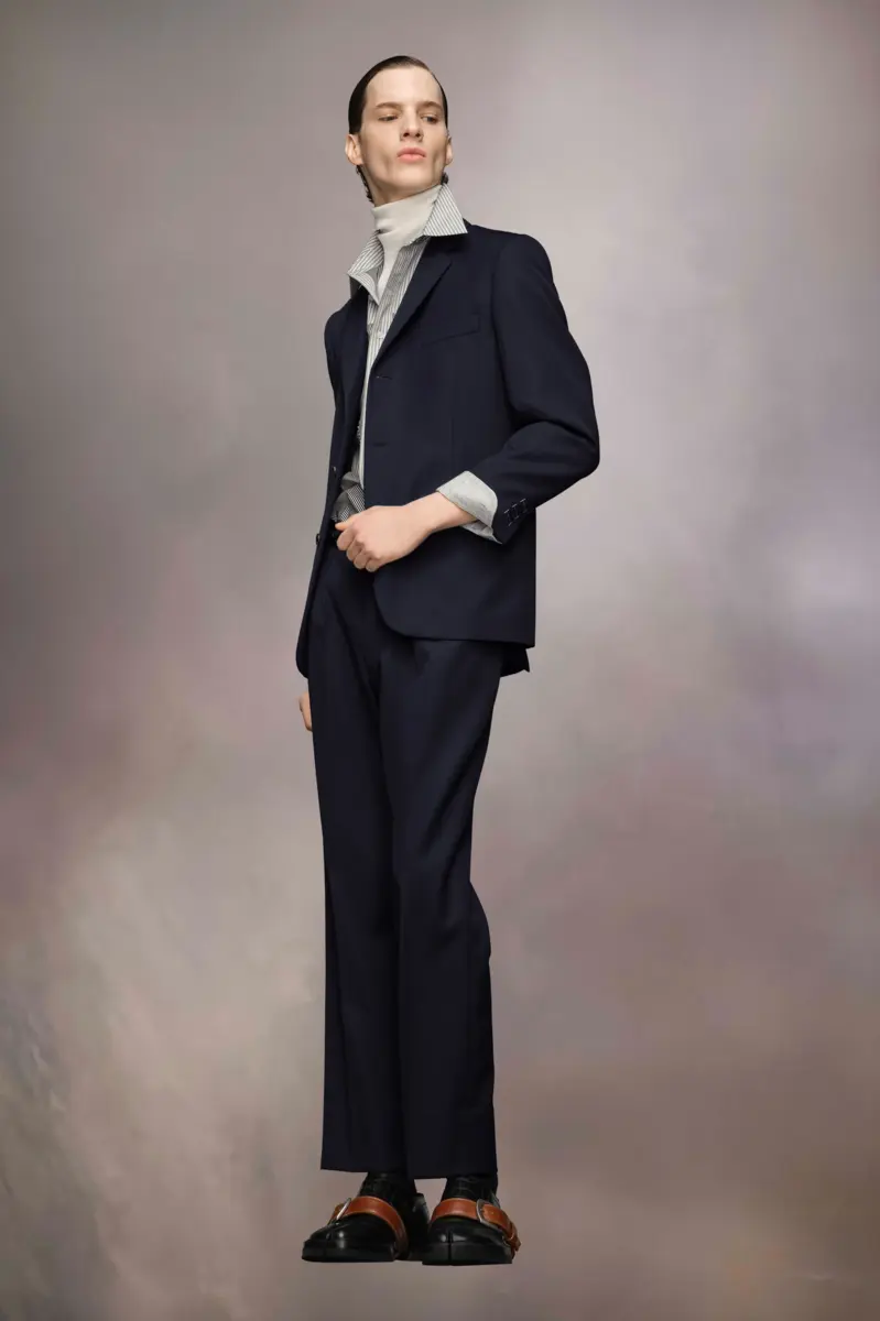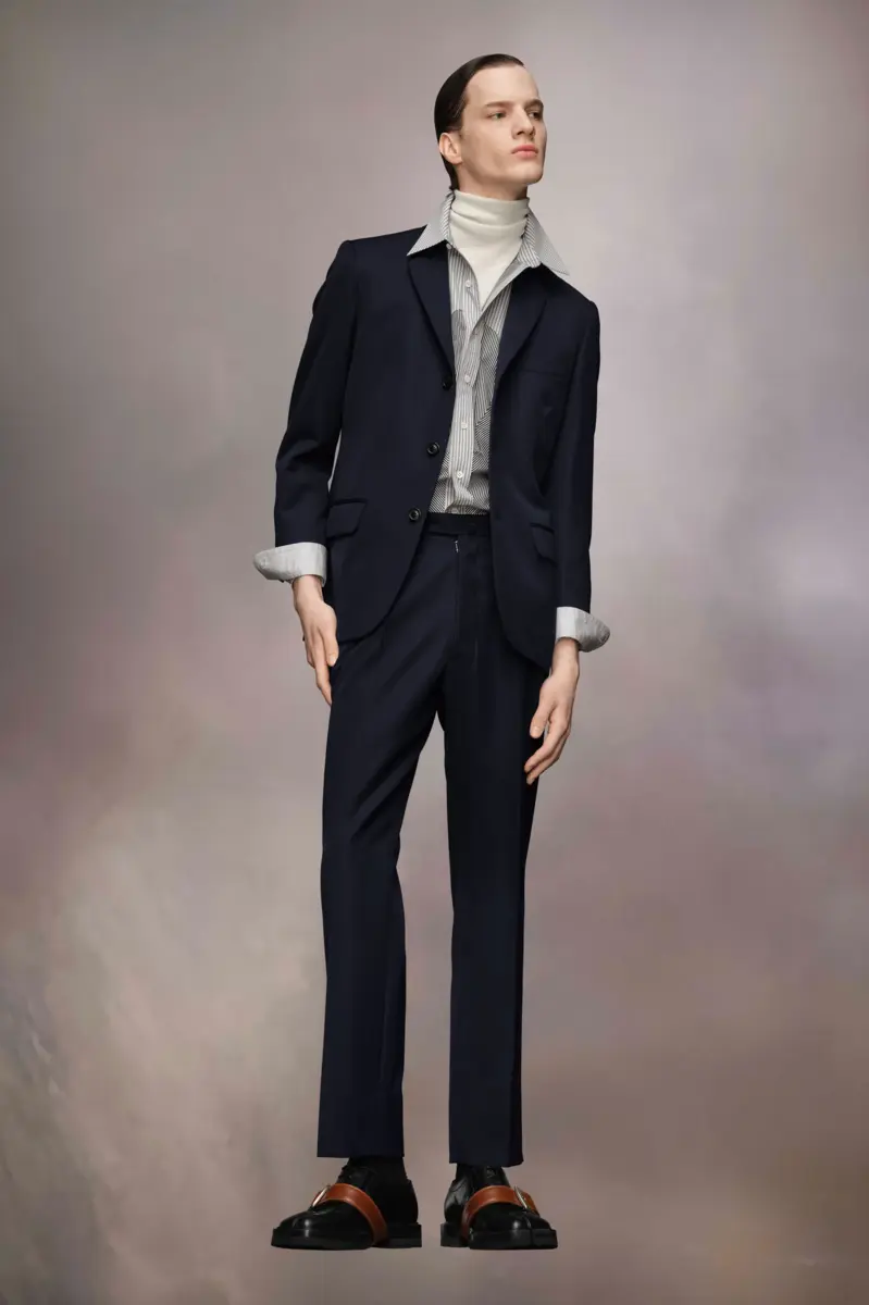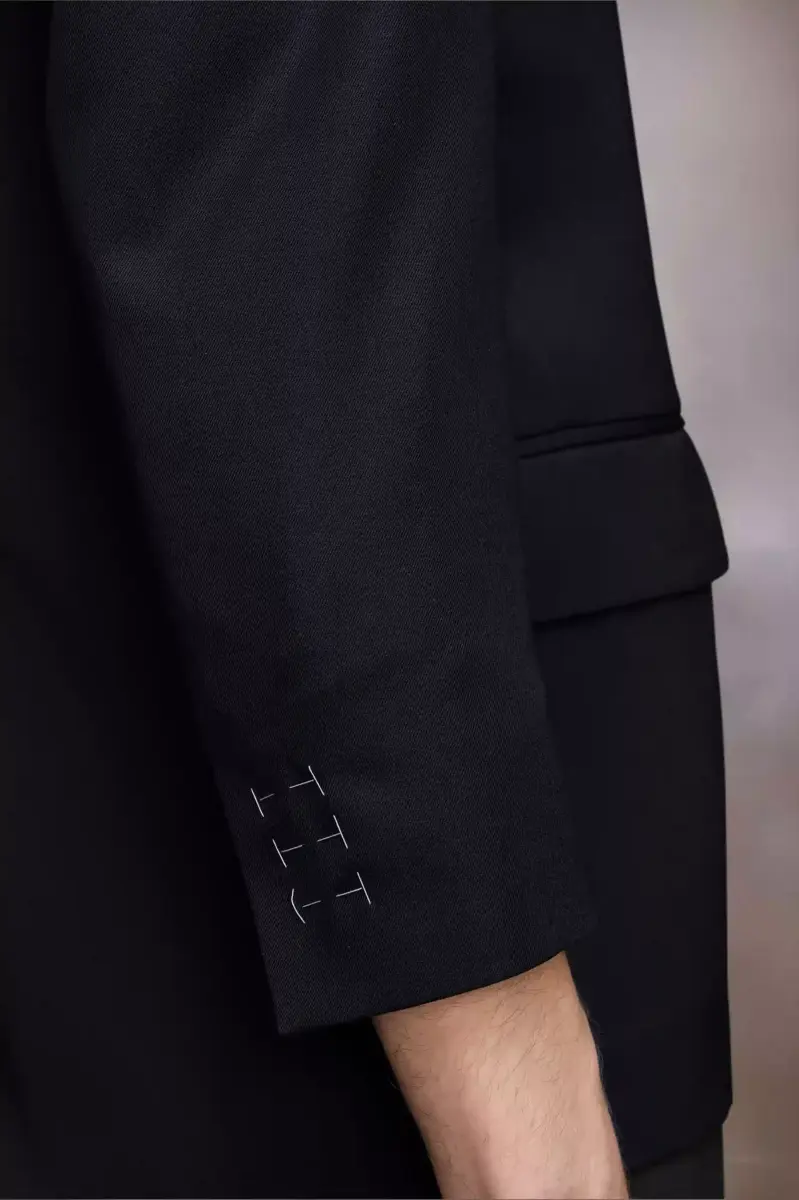Il blazer in lana vergine mohair britannica presenta un design monopetto con taschino sul petto e due tasche laterali con patta. Presenta un colletto a lancia, cuciture Work-in-progress sui polsini e uno spacco posteriore. Sul retro è presente la firma di Maison Margiela, i Quattro punti; l’opposto di un’etichetta.