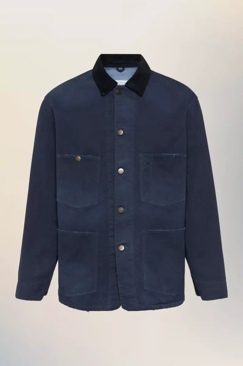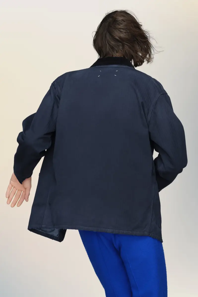 Questa giacca è caratterizzata da cuciture rovinate, ampie tasche applicate e chiusura con bottoni a contrasto. La finitura sbiadita dal sole e i dettagli irregolari richiamano i capi indossati all’aperto, mostrando tracce del tempo e allineandosi all’estetica rurale della collezione. La firma di Maison Margiela, i quattro punti, è presente sul retro, l’opposto di un’etichetta.