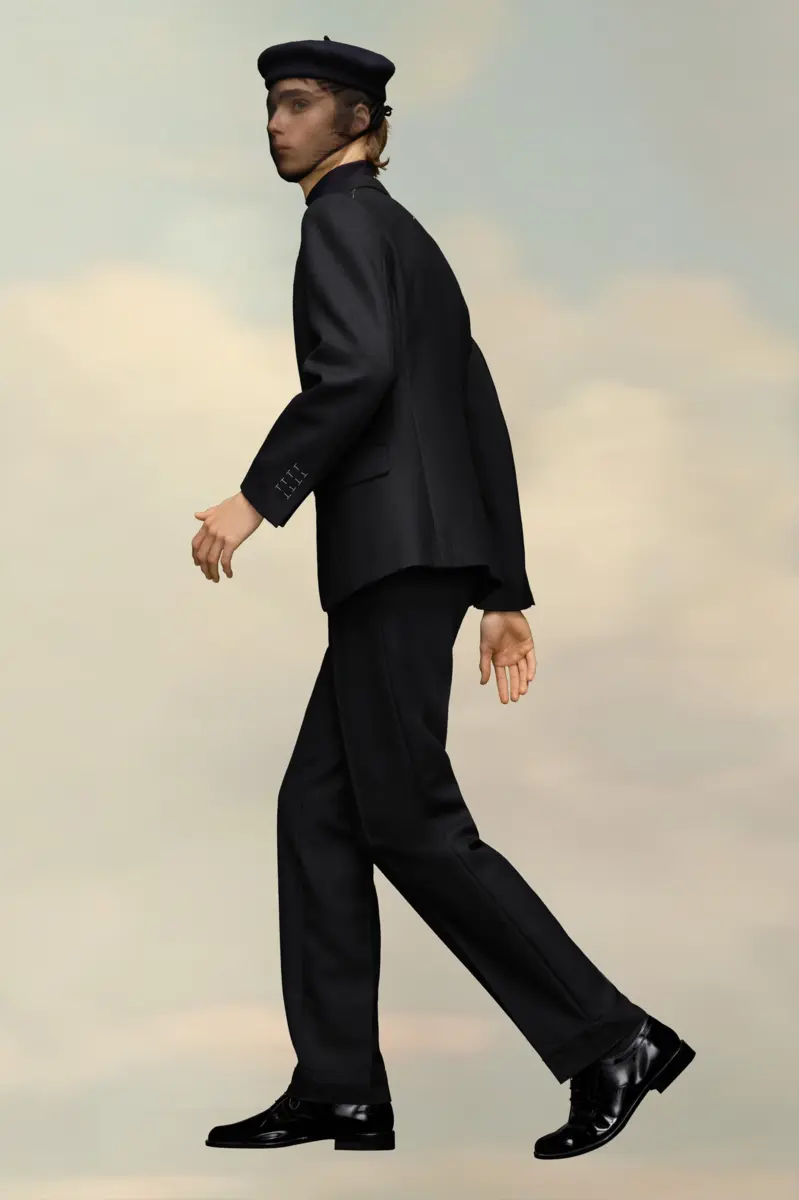 La giacca monopetto, realizzata in lana a spina di pesce, presenta le cuciture in lavorazione della Maison su un lato del colletto dentellato. Il logo numerico è presente all’interno.