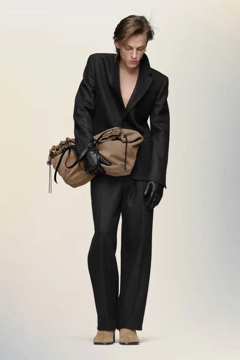 Questa giacca è realizzata in lana infeltrita per una struttura morbida e un peso naturale. Progettata con un revers a lancia e una silhouette rilassata, presenta tasche applicate oversize e dettagli cuciti sui polsini: una sottile espressione di sartorialità sovversiva. Sul retro, compaiono i quattro punti distintivi della Maison; l’opposto di un’etichetta.