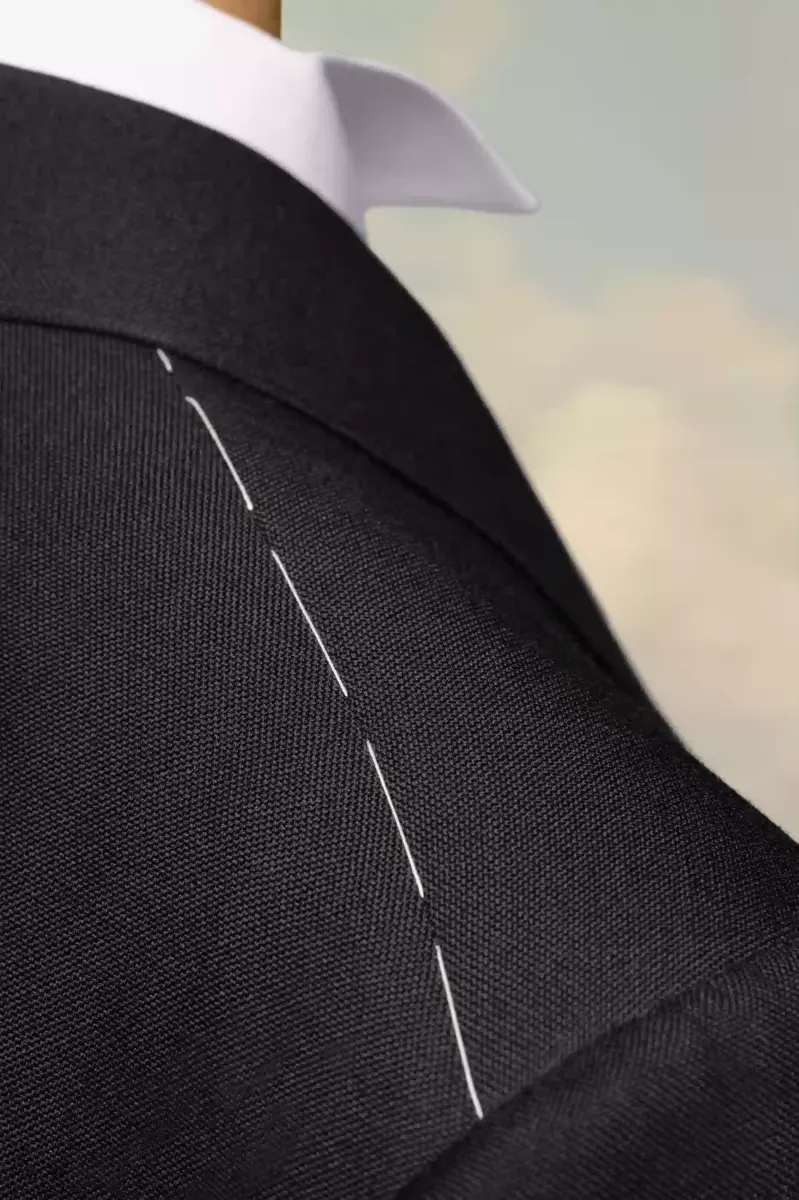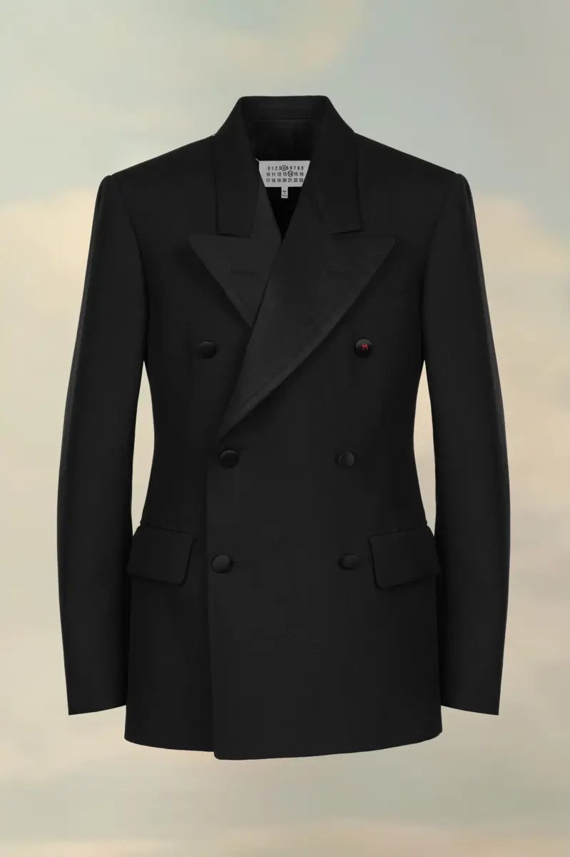 Con dettagli work-in-progress sui polsini, la giacca è doppiopetto con collo a lancia. Presenta due tasche a busta e uno spacco posteriore. La firma di Maison Margiela, le quattro cuciture, è visibile sul retro, l’opposto di un’etichetta.