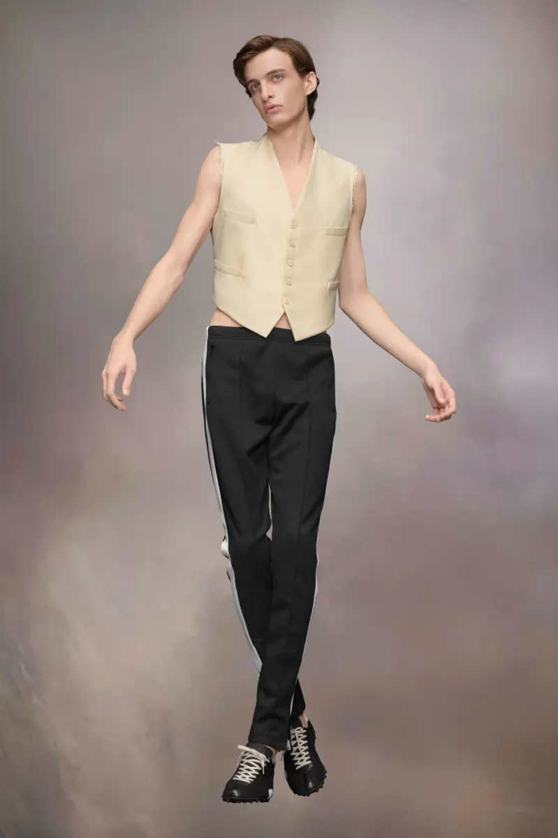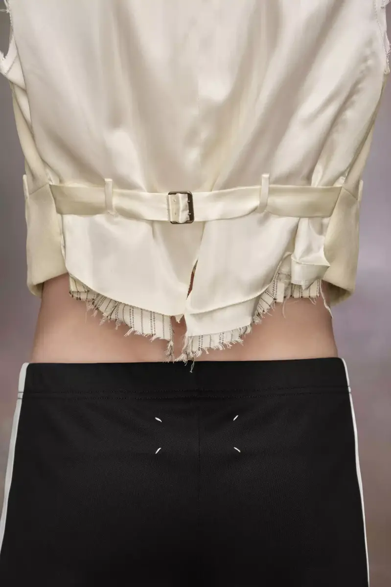 Realizzato in lana, il gilet incarna il concetto di anonimato della fodera della Maison. È a doppio strato e può essere indossato anche abbottonato come top. Presenta elementi usurati, con i bordi formali a punta sul davanti compensati dalle spalline e dalla scollatura strappate. Presenta una fibbia sul retro per una vestibilità regolabile. La firma di Maison Margiela, le quattro cuciture, è visibile sul retro; l’opposto di un’etichetta.