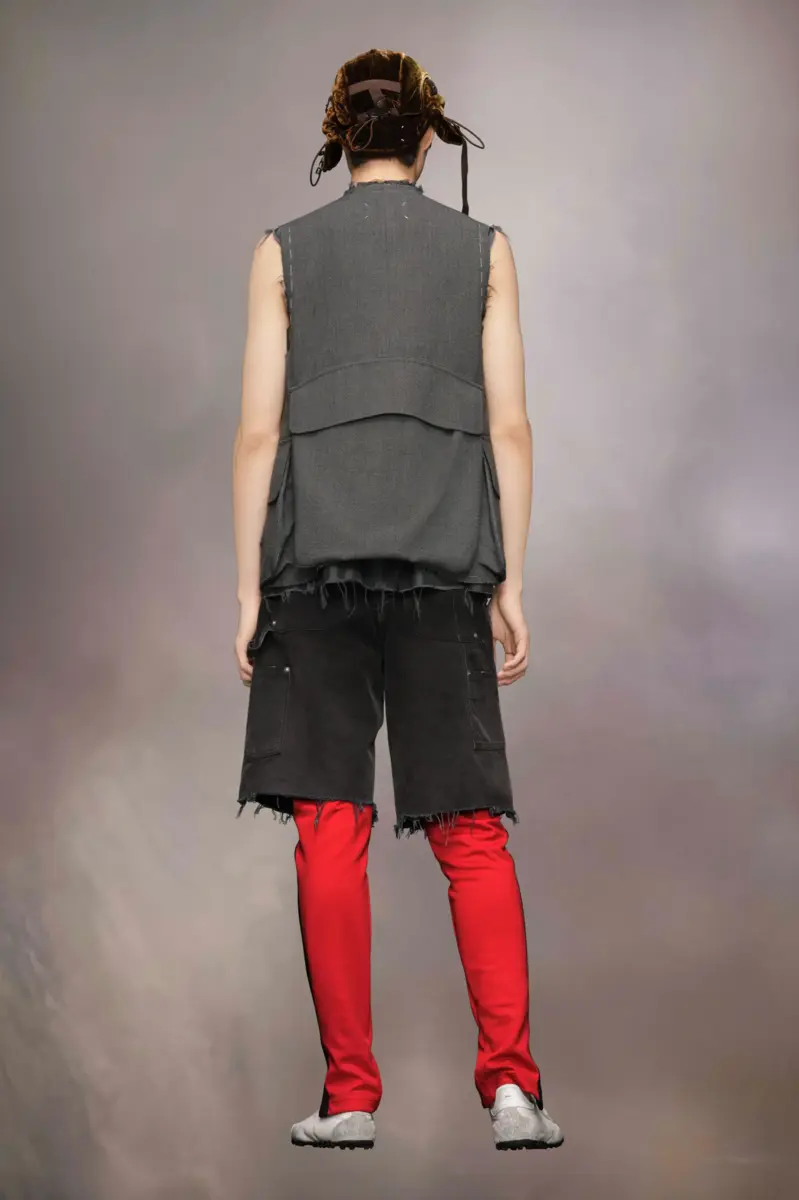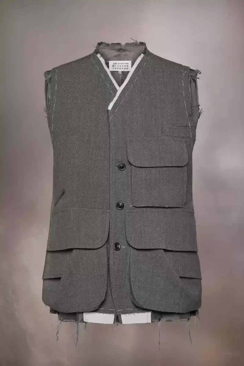 Esempio dell’approccio work-in-progress della Maison, la giacca senza maniche è realizzata in lana e presenta bordi rovinati e impunture. Con un design monopetto con scollo a V, la giacca ha un’attenzione all’utilità con molteplici tasche asimmetriche, tra cui una grande tasca con patta sul retro. La firma di Maison Margiela, i quattro punti, è presente sul retro; l’opposto di un’etichetta.