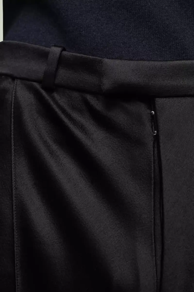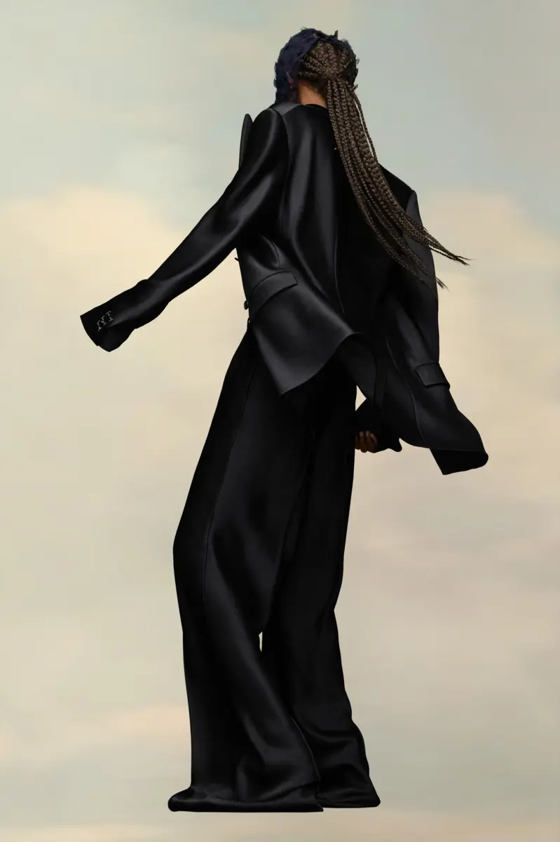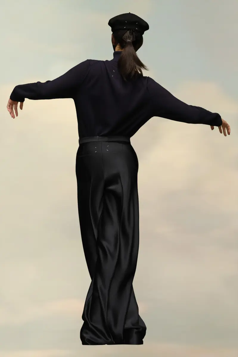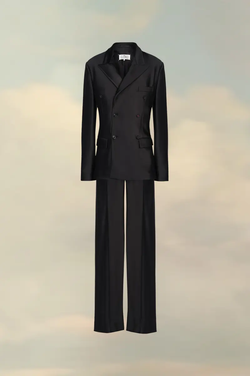 Realizzato in raso, questo abito due pezzi presenta una giacca doppiopetto con colletto a lancia e pantaloni oversize. I polsini richiamano il concept della Maison e presentano un bottone a M asimmetrico. Sul retro, le quattro cuciture bianche mostrano la mano della Maison: l’opposto di un’etichetta.