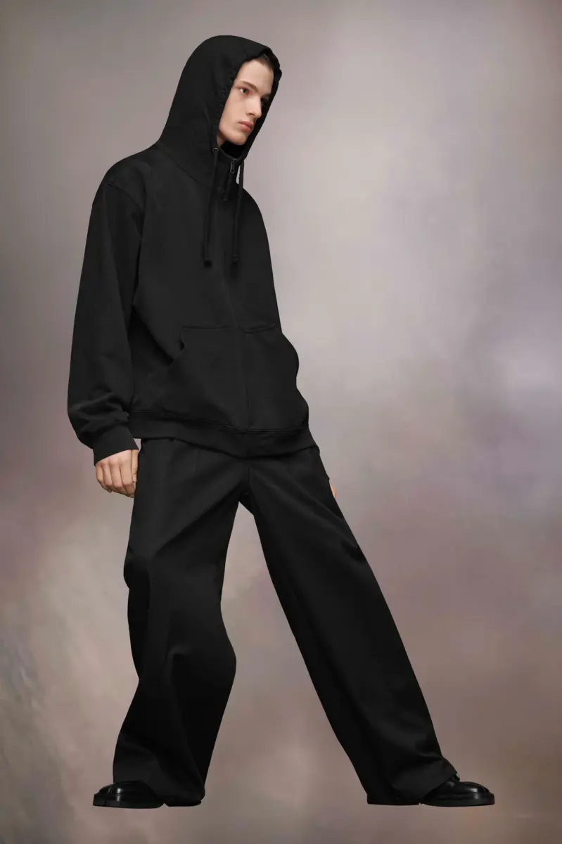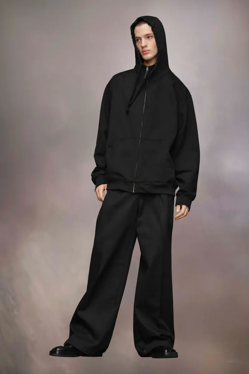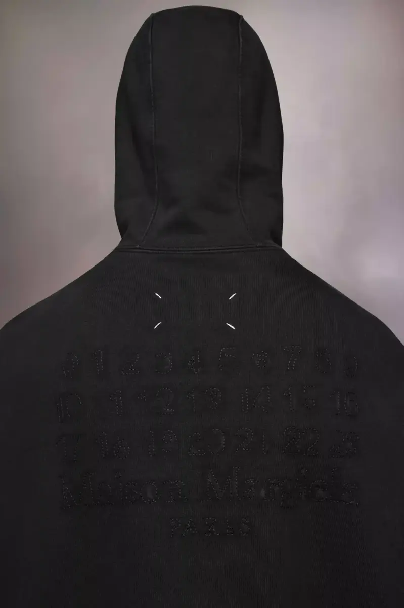 La felpa con cappuccio è realizzata in robusto pile di cotone con chiusura a zip e tasca a marsupio divisa sul davanti. Il retro presenta un ricamo Maison Margiela reverse tono su tono. La firma di Maison Margiela, i Quattro punti, è presente anche sul retro, l’opposto di un’etichetta.