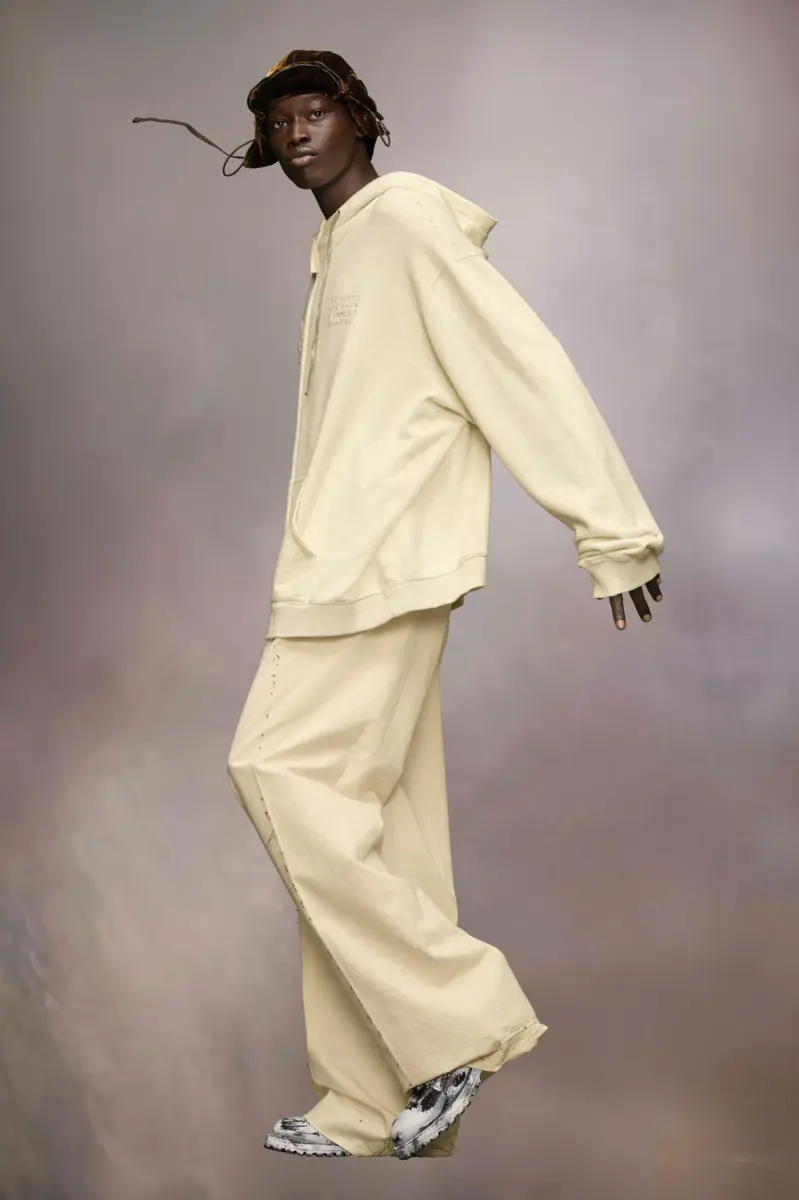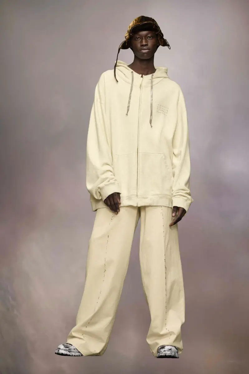 Realizzata in cotone, la felpa con cappuccio presenta un design con zip che divide la tasca anteriore. Il logo numerico è stampato sul lato del petto, volutamente sbiadito in alcune parti per un look vissuto. Il modello è rilassato, con una vestibilità oversize e un orlo ampio e arrotondato sul retro. Dettagli effetto consumato sono visibili ovunque, con una coulisse a contrasto sul cappuccio. La firma di Maison Margiela, le quattro cuciture, è presente sul retro; l’opposto di un’etichetta.