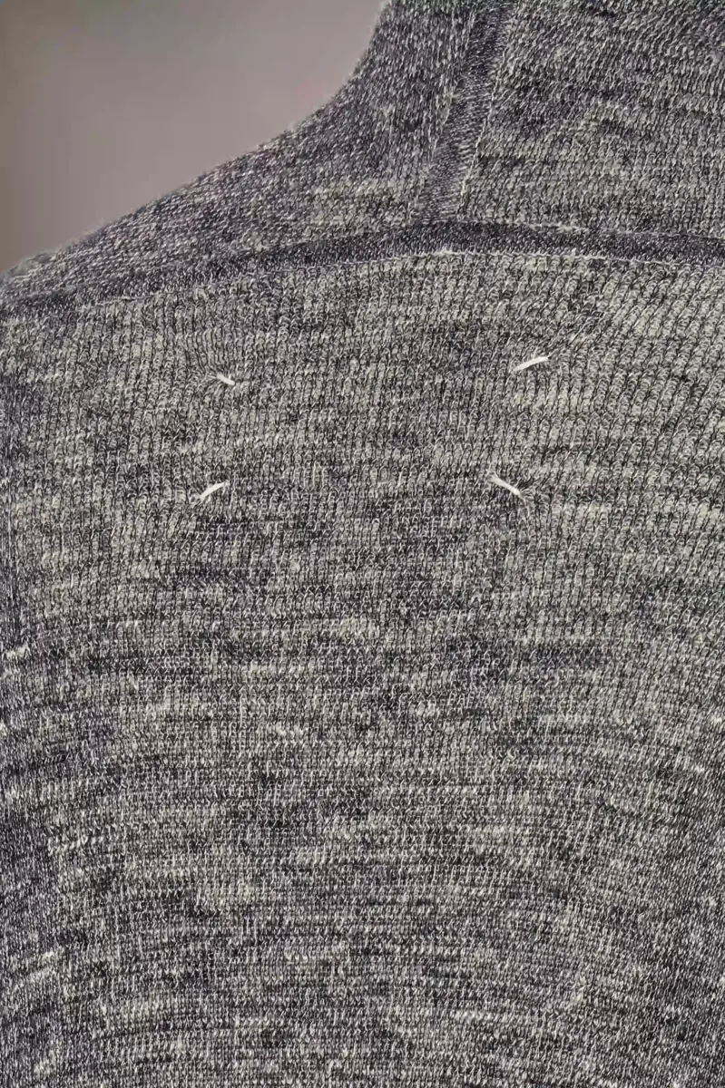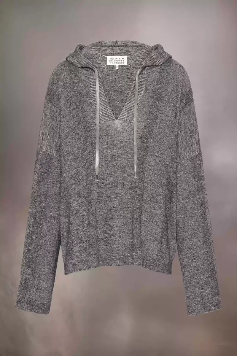 Progettata con una delicata colorazione chiné e rifinita con un delicato effetto rigato, la felpa in maglia è realizzata in misto lino e cotone. Ha una vestibilità comoda e uno scollo a V profondo, con bordi a coste, maniche extra lunghe e una silhouette allungata. La coulisse intorno al collo ricorda i lacci usati. La firma di Maison Margiela, i quattro punti, è visibile sul retro, l’opposto di un’etichetta.